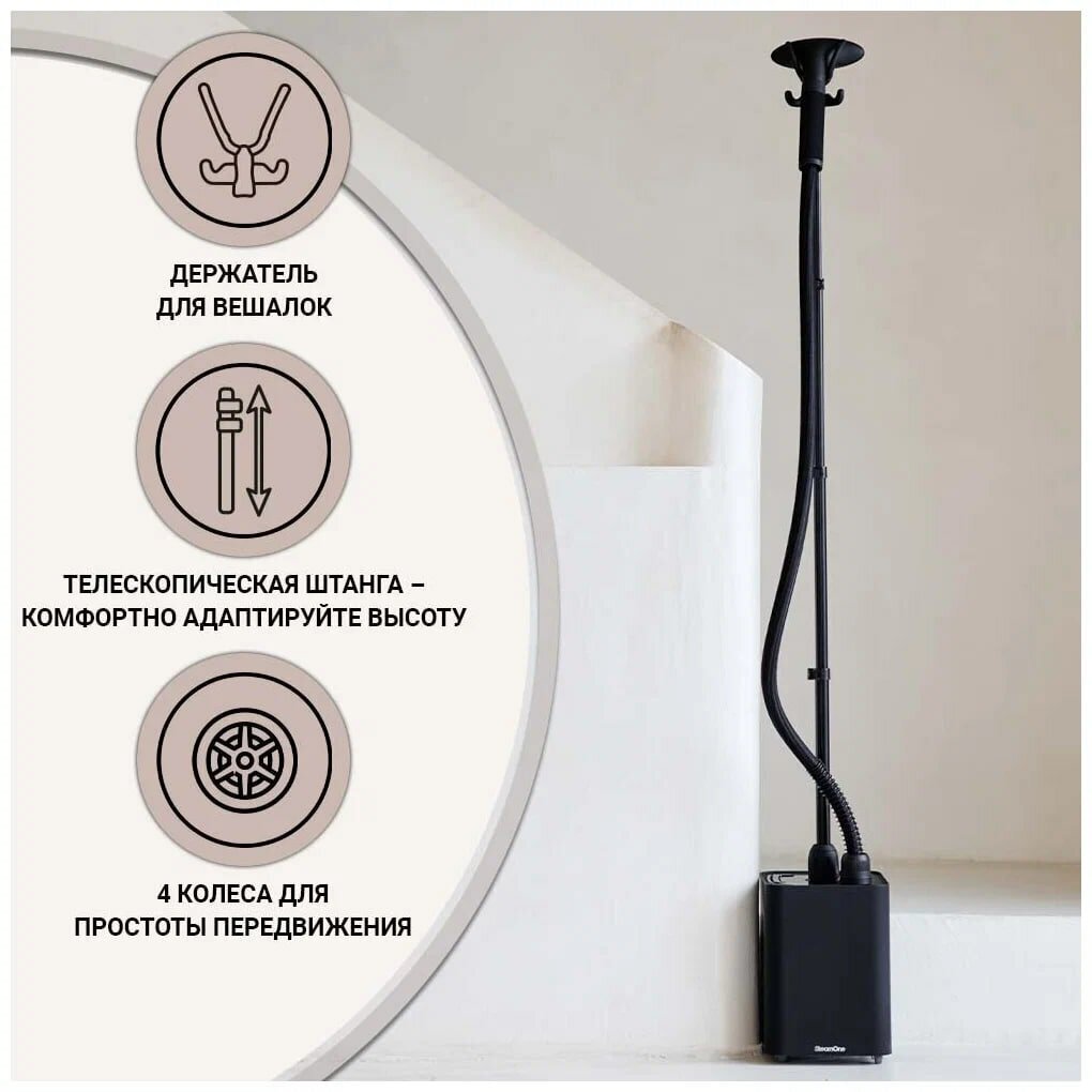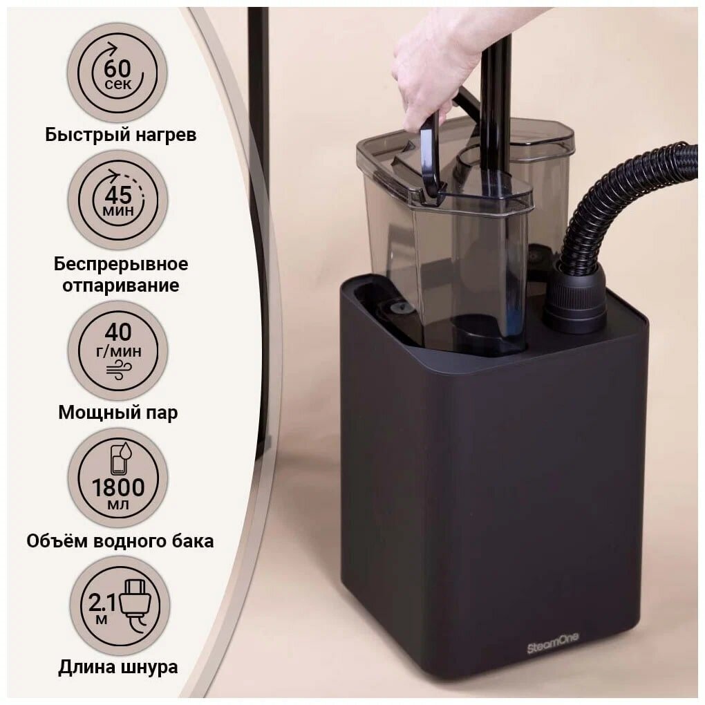 Вертикальный мобильный отпариватель высокого качества SteamOne создан для профессионального использования. Мощность 1900 Вт. Элегантный и компактный дизайн. Отпариватель готов к использованию через 60 секунд. Мощность подачи пара 40 г/мин и мягкий непрерывный пар с температурой 98 ° C обеспечивают разглаживание заломов на любой ткани. Мобильная база на колёсиках позволит перемещать устройство в помещении так, как удобно. Отпариватель работает автономно 45 минут, объем резервуара для воды — 1.8 л. Отпариватель SteamOne – идеальное решение как для профессионального, так и для домашнего использования. Компактная конструкция с максимальной эффективностью. В приборе используется лучший алюминиевый нагреватель, чтобы обеспечить самую высокую скорость подачи пара на рынке и гарантировать наилучшее отпаривание от самых тонких до самых толстых тканей без риска сжечь ткань. Паровая головка разработана таким образом, чтобы вертикальный отпариватель обеспечивал наилучшее распространение пара без ущерба для маневренности. Отпариватель легкий и защищен теплоизоляционной пеной, что позволяет легко разгладить одежду. Постоянный и оптимизированный поток пара обеспечивает комфорт, эффективность и предотвращает попадание воды на одежду. Отпариватель удаляет 99,99% микробов, бактерий и вирусов* с тканей за один раз. Это означает, что помимо отпаривания вы можете очистить свою одежду и особенно пальто после поездки в общественном транспорте, чтобы удалить запахи, или просто очистить столовое и постельное бельё! (*Научные испытания, проведенные в июне 2020 года с помощью отпаривателя SteamOne лабораторией Scitec, Лозанна, Швейцария. Антибактериальная эффективность (Escherichia coli и Staphylococcus aureus) с устранением 99,99%). Устройство стильное и изящное, легко помещается в углу комнаты и сочетается с декором. Без ущерба для эффективности конструкция изделия оптимизирована так, что занимает мало места. Каждый материал продуман до мелочей, чтобы облегчить жизнь пользователя, включая термошланг с тройной защитой, чтобы избежать ожогов во время отпаривания. Вертикальный отпариватель имеет держатель для вешалок, так что вы можете брать одежду прямо из шкафа и отпаривать ее. Модель оснащена технологией защиты от накипи для увеличения срока службы. В комплекте прилагается классическая перчатка SteamOne, чтобы защитить руки во время отпаривания ткани, а также крючок для одновременного размещения нескольких вешалок для отпаривания разной одежды.