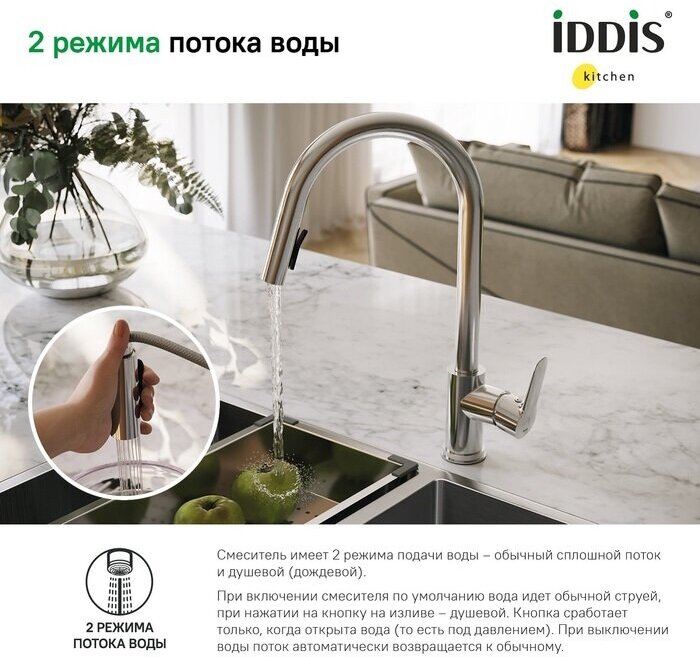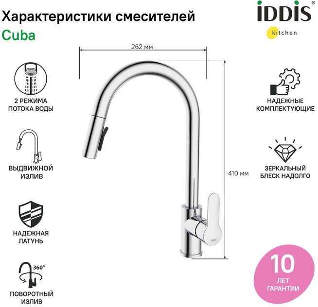 Смеситель Cuba обладает улучшенным функционалом и хорошо узнаваемым дизайном плавных линий коллекции. Модель соответствует высоким стандартам любой современной кухни. Излив смесителя выдвигается на 45 см, что позволяет направлять струю воды в нужную точку раковины для поддержания безупречной чистоты. В смесителе предусмотрено 2 режима подачи воды: аэрированная струя – для быстрого наполнения емкостей и работы в привычном режиме; «душ» – для ополаскивания посуды или мытья овощей и фруктов. Переключение между режимами производится кнопкой на внутренней стороне излива. • Смеситель IDDIS® прослужит долго благодаря надежному корпусу из прочной нержавеющей стали, неподверженной коррозии, резким изменениям давления и перепадам температуры воды.• Хромированное покрытие смесителя IDDIS® устойчиво к коррозии, появлению царапин, сколов и потускнению. На протяжении многих лет он будет выглядеть как новый. • Керамический картридж обеспечивает точную регулировку температуры и напора воды за счет особенно плавного хода ручки смесителя.• Гарантия на смесители IDDIS® — 10 лет.(с) Авторский текст, октябрь 2022 г. Смеситель Cuba обладает улучшенным функционалом и хорошо узнаваемым дизайном плавных линий коллекции. Модель соответствует высоким стандартам любой современной кухни. Излив смесителя выдвигается на 45 см, что позволяет направлять струю воды в нужную точку раковины для поддержания безупречной чистоты. В смесителе предусмотрено 2 режима подачи воды: аэрированная струя – для быстрого наполнения емкостей и работы в привычном режиме; «душ» – для ополаскивания посуды или мытья овощей и фруктов. Переключение между режимами производится кнопкой на внутренней стороне излива. • Смеситель IDDIS® прослужит долго благодаря надежному корпусу из прочной нержавеющей стали, неподверженной коррозии, резким изменениям давления и перепадам температуры воды.• Хромированное покрытие смесителя IDDIS® устойчиво к коррозии, появлению царапин, сколов и потускнению. На протяжении многих лет он будет выглядеть как новый. • Керамический картридж обеспечивает точную регулировку температуры и напора воды за счет особенно плавного хода ручки смесителя.• Гарантия на смесители IDDIS® — 10 лет.(с) Авторский текст, октябрь 2022 г.
