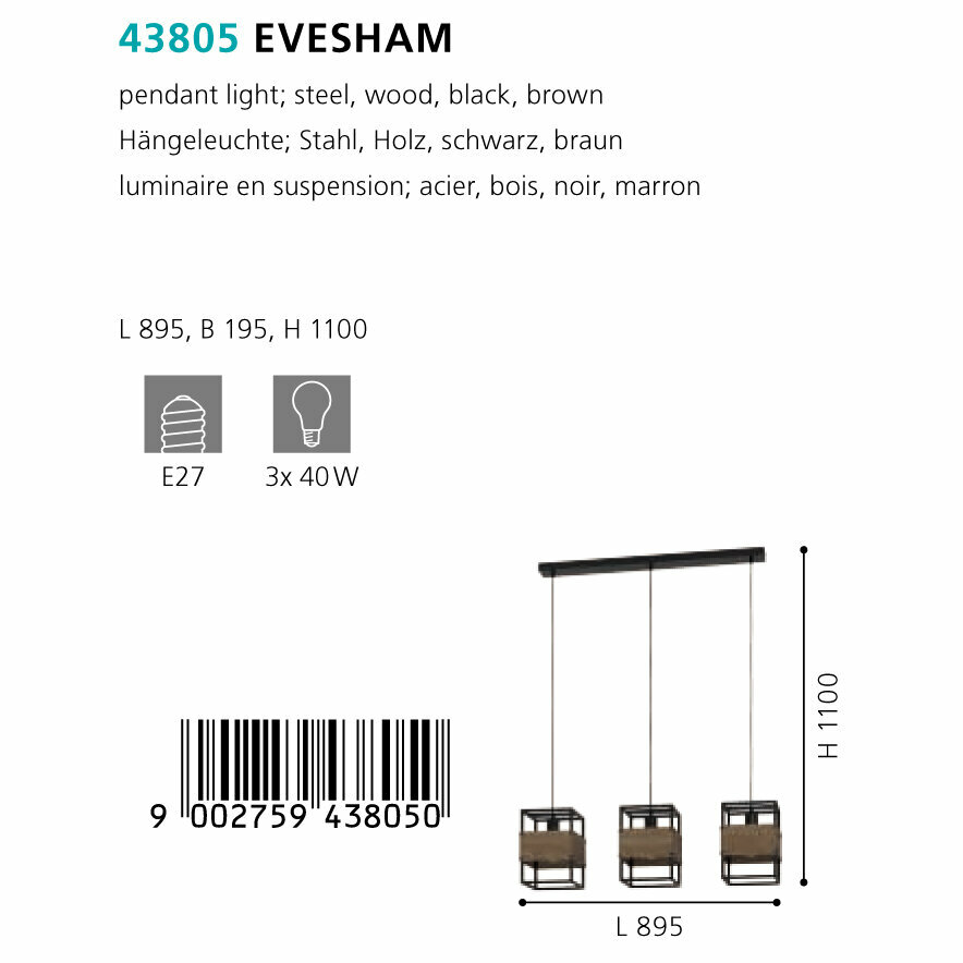 | Номенклатура | 43805 Подвесной потолочный светильник (люстра) EVESHAM, 3Х40W, E27, L890, B190, H1100, сталь, дерево, черный, коричневый |