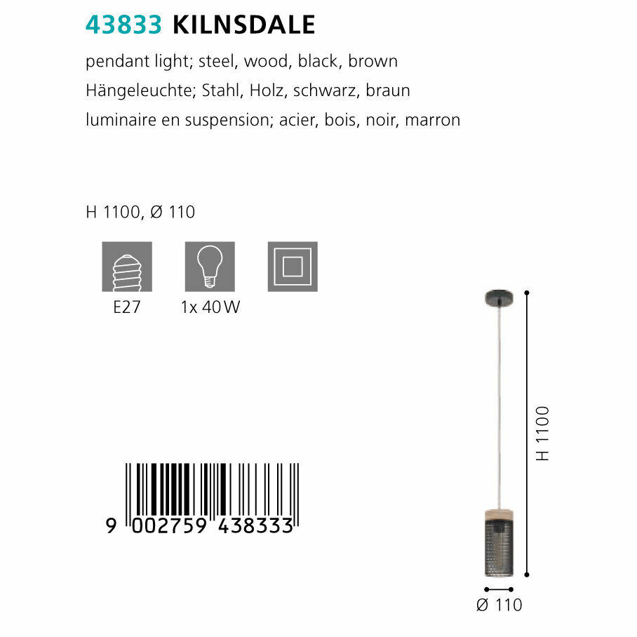 | Номенклатура | 43833 Подвесной потолочный светильник (люстра) KILNSDALE, 1Х40W, E27, H1100, ?110, сталь, дерево, черный, коричневый |