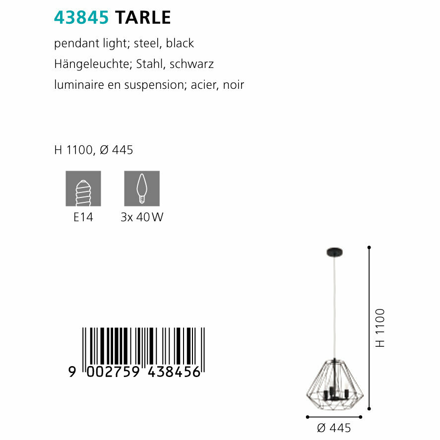 | Номенклатура | 43845 Подвесной потолочный светильник (люстра) TARLE, 3Х40W, E14, H1100, ?445, сталь, черный |