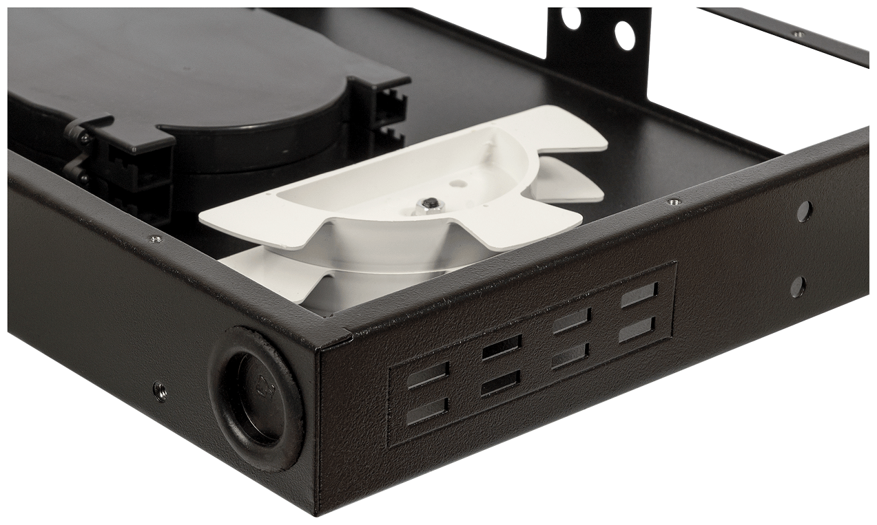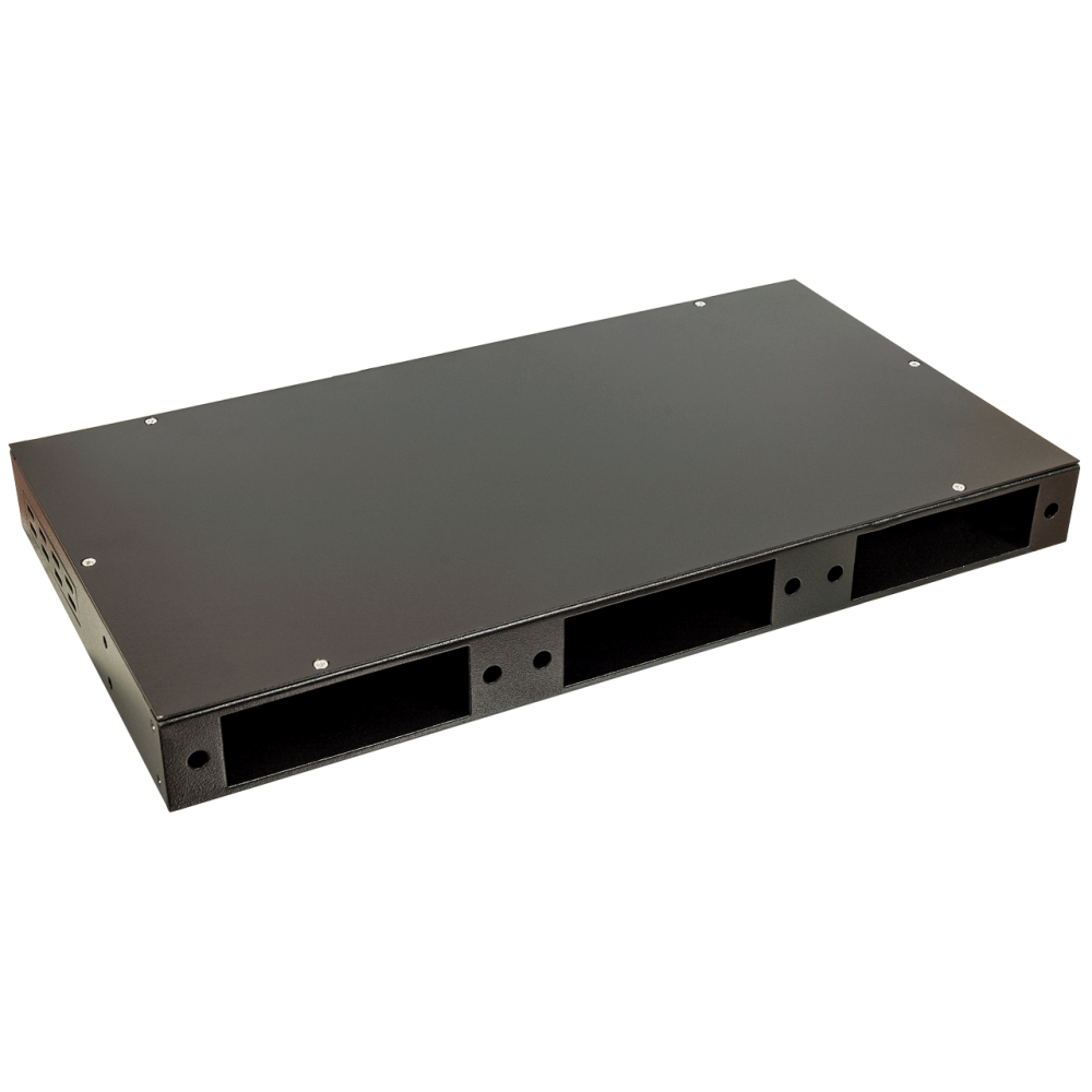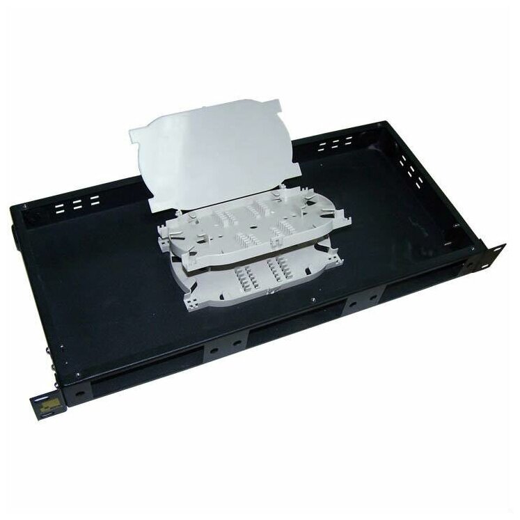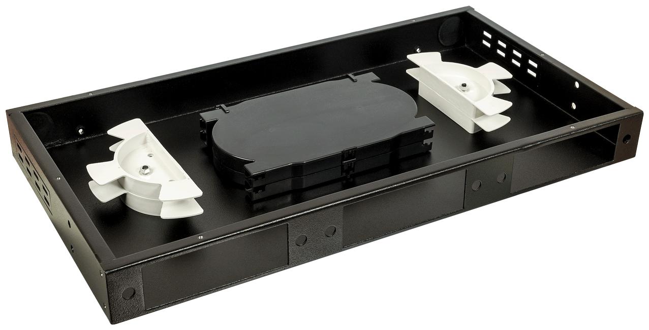 Кроссы предназначены для монтажа оптического кабеля в 19" шкафах и стойках. Выпускаются кроссы высотой 1U, 2U и 3U.Кросс высотой 1U стандартно укомплектован 2-мя сплайс-пластинами, с возможностью установки еще одной дополнительной пластины, и позволяет установить до 3-х адаптерных панелей, на 8 адаптеров каждая. Максимальная емкость кросса 1U - 24 адаптера и 96 волокон при использовании квадро адаптеров LC.Кросс высотой 2U стандартно укомплектован 4-мя сплайс-пластинами, с возможностью установки еще двух дополнительных пластин, и позволяет установить до 6-ти адаптерных панелей, на 8 адаптеров каждая.Максимальная емкость кросса 2U - 48 адаптеров и 192 волокна при использовании квадро адаптеров LC.Кросс высотой 3U стандартно укомплектован 6-ю сплайс-пластинами, с возможностью установки еще двух дополнительных пластин, и позволяет установить до 9-ти адаптерных панелей, на 8 адаптеров каждая. Максимальная емкость кросса 3U - 72 адаптера и 288 волокон при использовании квадро адаптеров LC.На лицевой поверхности кросса устанавливаются съемные металлические адаптерные панели артикулов LAN-APM-8DP, LAN-APM-8SC, LAN-APM-8FC. Для закрытия неиспользуемых посадочных мест в кроссе используются заглушки артикула LAN-APM-BLNK. Фиксация адаптерных панелей и заглушек осуществляется с помощью пластиковых защелок.Кросс имеет специальные фиксаторы центрального силового элемента оптического кабеля. Отверстия для ввода оптического кабеля закрыты резиновыми уплотнителями.Материал: холоднокатаная сталь толщиной 1,2 мм.Окраска: порошковое напыление.Цвет: черный (RAL9004).Габаритные размеры (ГхШхВ): 200мм х 433мм х 1U/2U/3U
