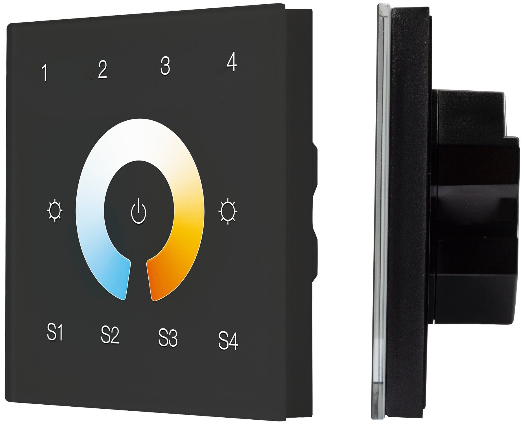 Настенная встраиваемая стеклянная панель черного цвета с сенсорным управлением (сенсорное кольцо и 11 сенсорных кнопок) для светодиодных MIX-лент. 4 группы управления, 4 ячейки памяти пользовательских настроек. Питание от сети 230В, или от шины DALI. При питании от сети 230В, панель является источником питания шины 100мА. Система команд DT8, до 64 устройств (DALI-DT8), при адресации DT8 2х каналов (CW+WW) на 1 адрес.