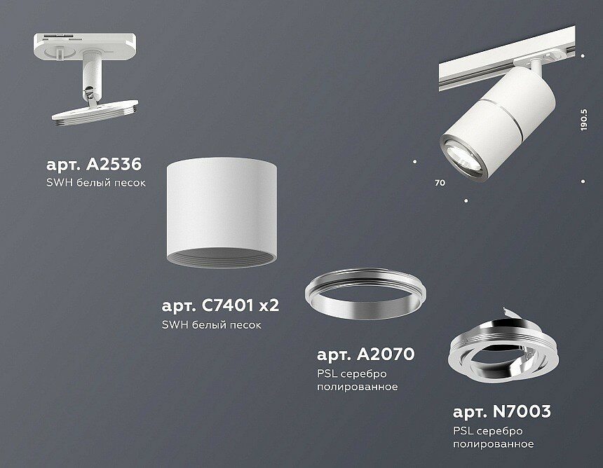 | Дополнительные характеристики | крепеж трековый D70, корпус накладной D70*2шт, коннектор D70, насадка передняя D70 |