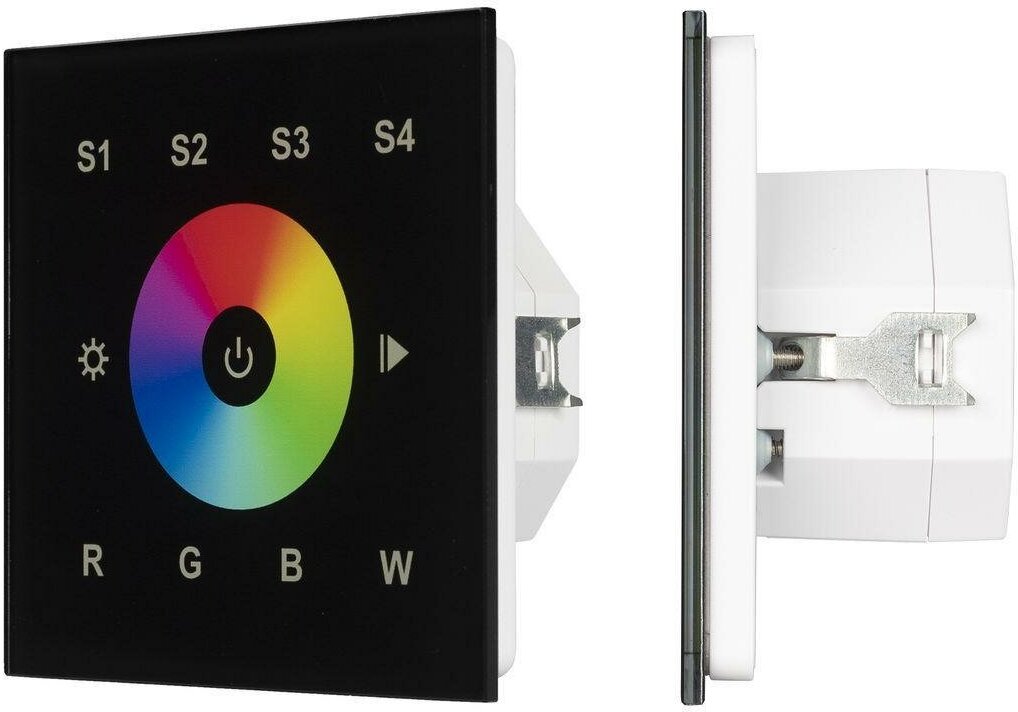 Настенная встраиваемая стеклянная панель белого цвета с сенсорным управлением (сенсорное кольцо и 11 сенсорных кнопок) для мультицветных светодиодных RGBW-лент. 1 зона управления, 4 слота памяти пользовательских настроек. Питание от 230V или от шины DALI. Система команд DT8: до 64 устройств (DALI-DT8), при адресации DT8 4 каналов (RGBW) на 1 адрес.