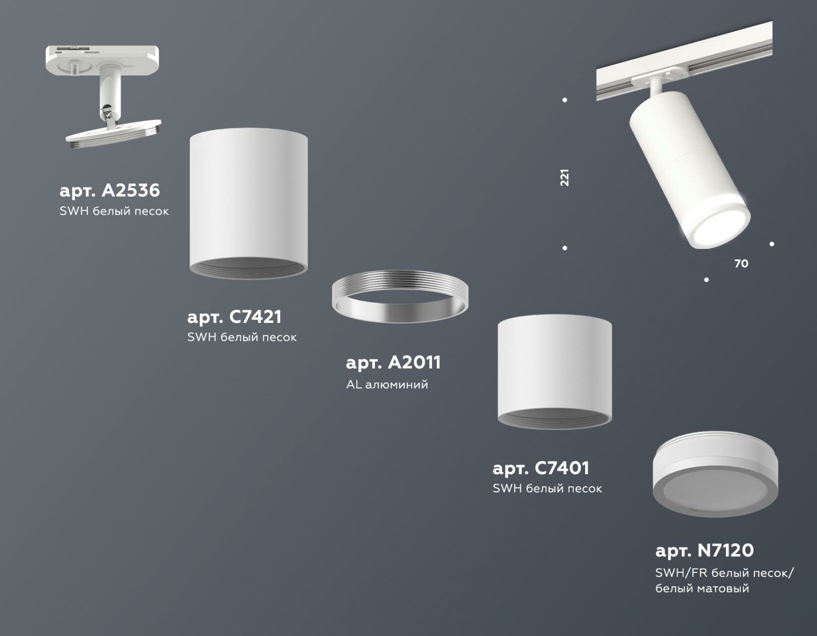 | Дополнительные характеристики | крепеж трековый D70, корпус накладной D70*2шт, коннектор скрытый D70, насадка передняя D70 |