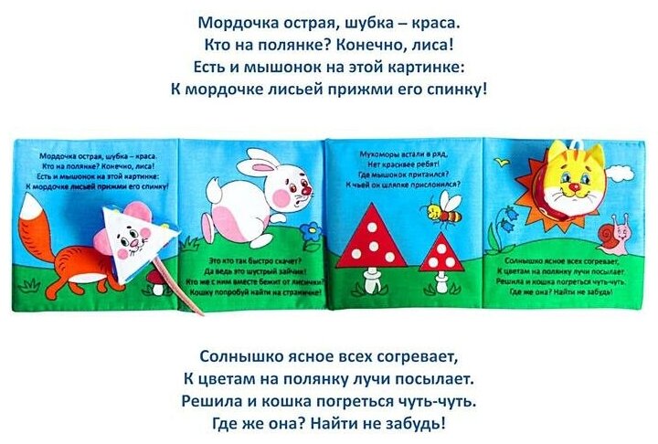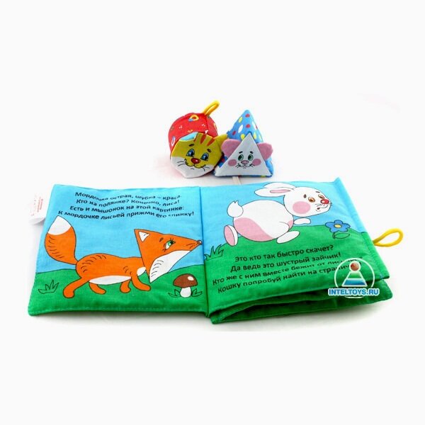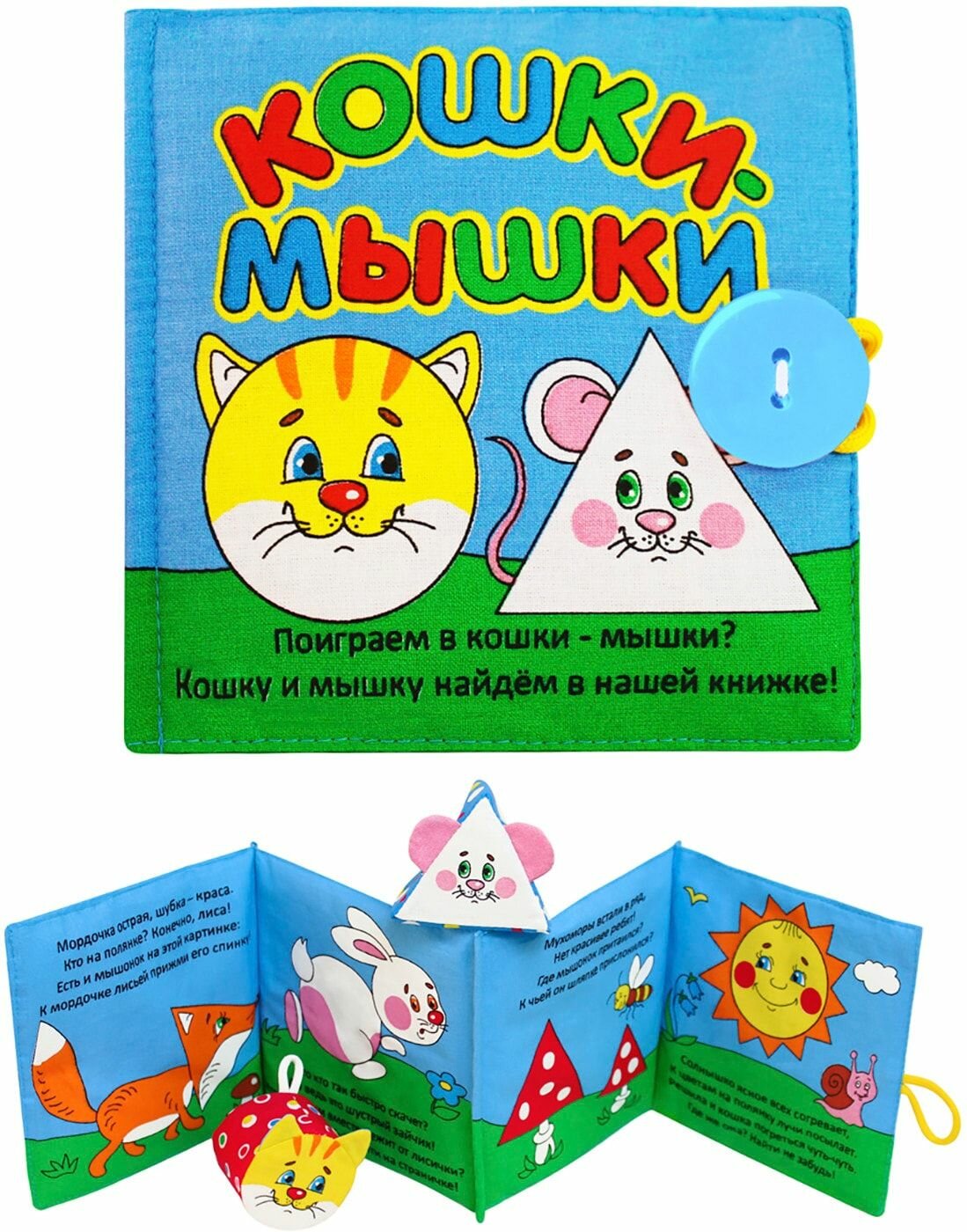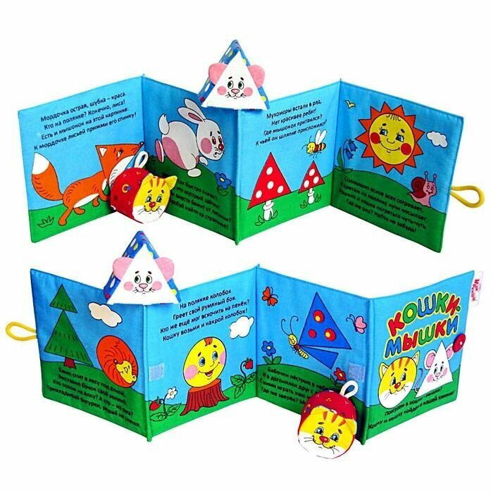Книжка тканевая, раскладывается гармошкой, посередине липучка, чтобы книжка не раскрывалась самостоятельно, а спереди пуговка с петелькой. Внутри картинки и стихи - учим формы "круг" и "треугольник". Нужно к круглому чему-то (солнышко и др.) приложить круглого кота, или к треугольной форме (ель и др.) приложить треугольную мышь, которые прилагаются к книге. В мышке есть пищалка. Всё очень мягкое и очень удобно помещается в детскую руку. Читать нам рано, разглядывает картинки и обсасывает книгу, кота и мышь. Особенно мышь.