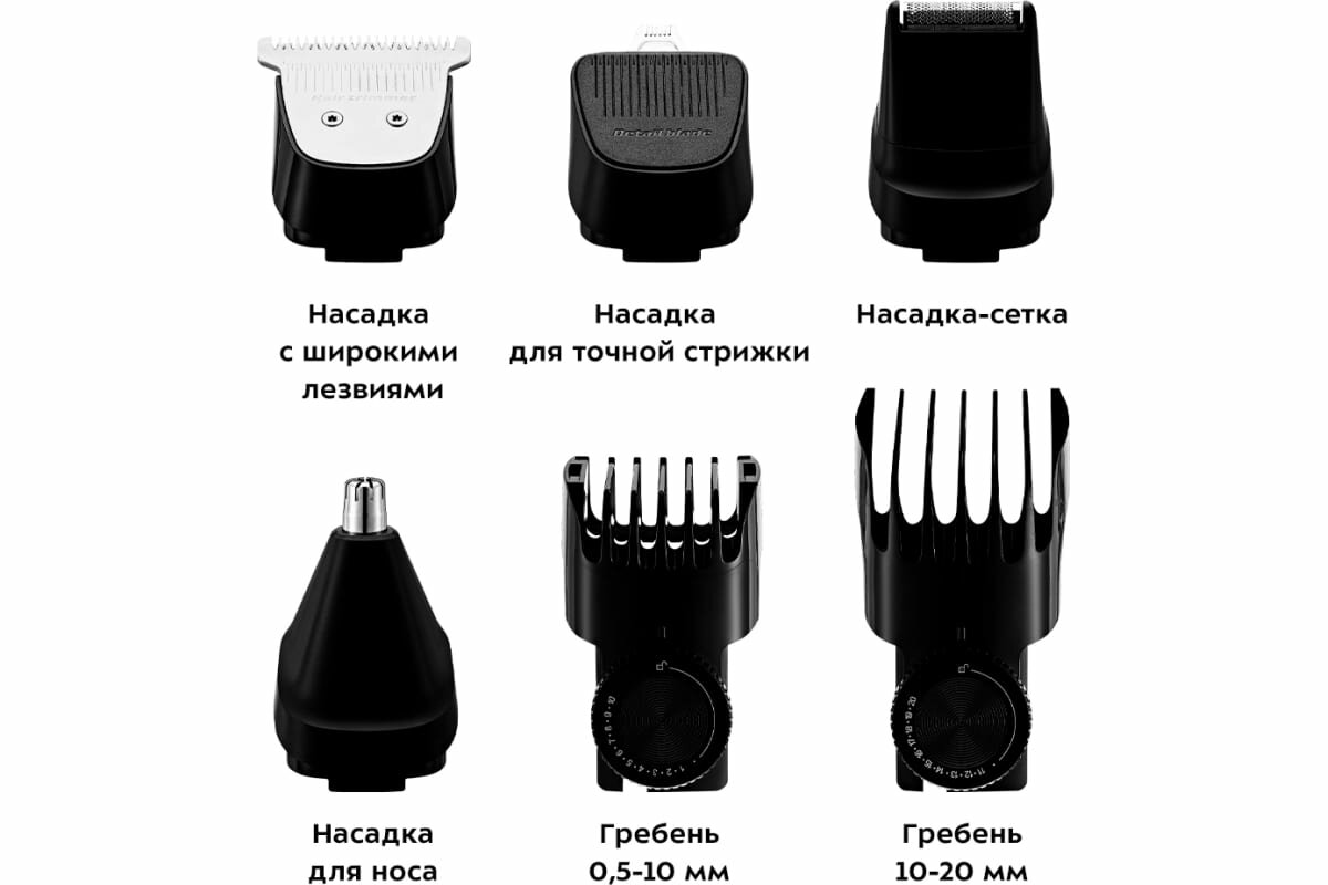 | Комплект поставки | Триммер Гребень «0,5–10 мм» Гребень «10–20 мм» Насадка с узкими лезвиями Насадка с широкими лезвиями Насадка для носа Насадка для точной стрижки Насадка-сетка Щетка для чистки Расческа Шнур питания USB Type-C Бутылочка с маслом База |