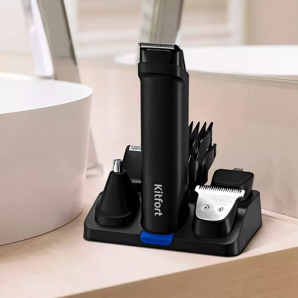 Триммер «4 в 1» Kitfort KT-3140—это прибор для бритья, стрижки, подравнивания бороды, усов или бакенбард, а также для стрижки волос в носу и ушах. Корпус триммера компактен, что позволяет брать его с собой в командировки, походы и путешествия. Кнопка включения находится на задней части корпуса триммера, служит для включения и выключения устройства. Лезвия триммера KT-3140 выполнены из нержавеющей стали. Лезвия быстро и тщательно удаляют нежелательные волосы, обеспечивая качественную стрижку волос. Насадка для точной стрижки удобна для подравнивания бровей или усов. Насадкой с широкими лезвиями с гребнем можно стричь волосы на голове. Насадка-сетка предназначена для бритья и подравнивания короткой щетины на лице. Если вам нужно оставить волосы определенной длины, используйте гребни. Устройство оснащено удобным регулятором, который позволяет установить длину волос в необходимом диапазоне. Зарядить аккумулятор можно с помощью шнура USB Type-C, идущего в комплекте с устройством. Время зарядки полностью разряженного аккумулятора 2 ч. Для удобства и экономии пространства храните бритву и насадки на подставке. В комплекте к триммеру идёт щётка для чистки лезвий и бутылочка с маслом для смазывания лезвий. Всё, что нужно, для чистоты и исправной работы триммера!