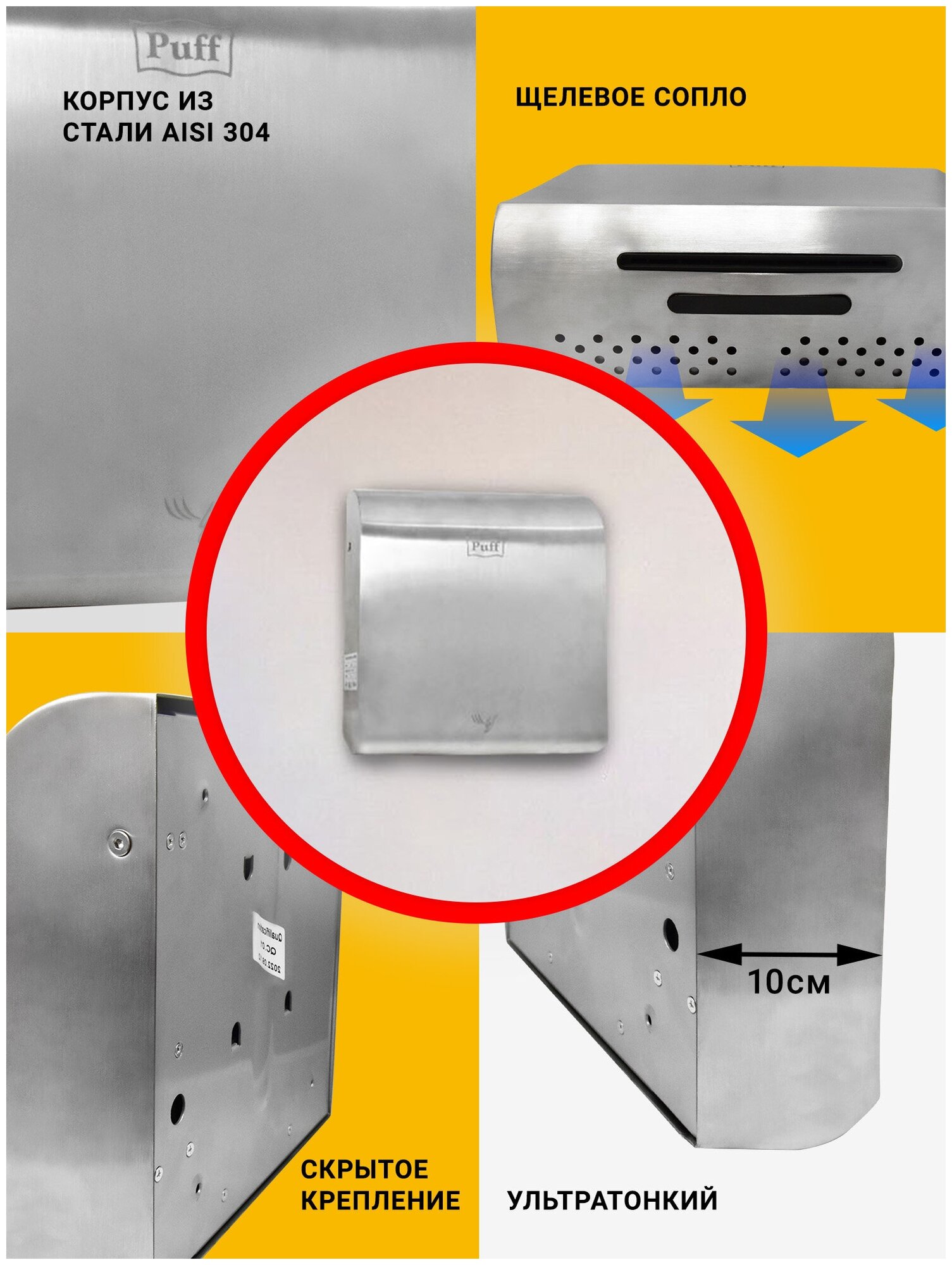 Ультратонкий электросушитель для рук модели Puff-8855 предназначен для использования в общественных местах с высокой проходимостью. Для бесперебойной работы и увеличения срока службы, модель оснащена двумя фильтрами для защиты мотора от пыли. Модель отличается компактным размером, но при этом высокоскоростной и бережной сушкой рук.