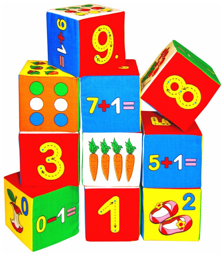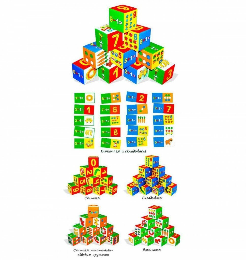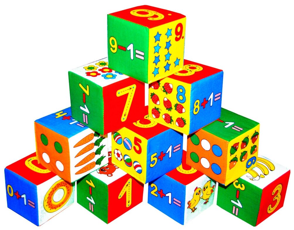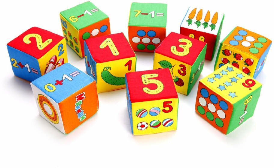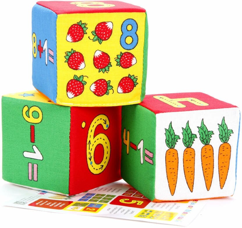Кубики-мякиши Умная математика помогут ребенку в игровой форме изучить цифры и простые арифметические действия над ними. На гранях кубиков, изготовленных из мягких материалов, расположены различные изображения, которые помогут малышу в обучении. Так, например, одна грань кубиков содержит цифры от 1 до 9 и 0, другая - примеры на сложение и вычитание, ответ на которые ребенок сможет поставить рядом в виде какой-либо цифры. Также на гранях изображены рисунки овощей и фруктов, точечки и другие изображения, которые можно посчитать, тем самым практикуя свои навыки в математике.
