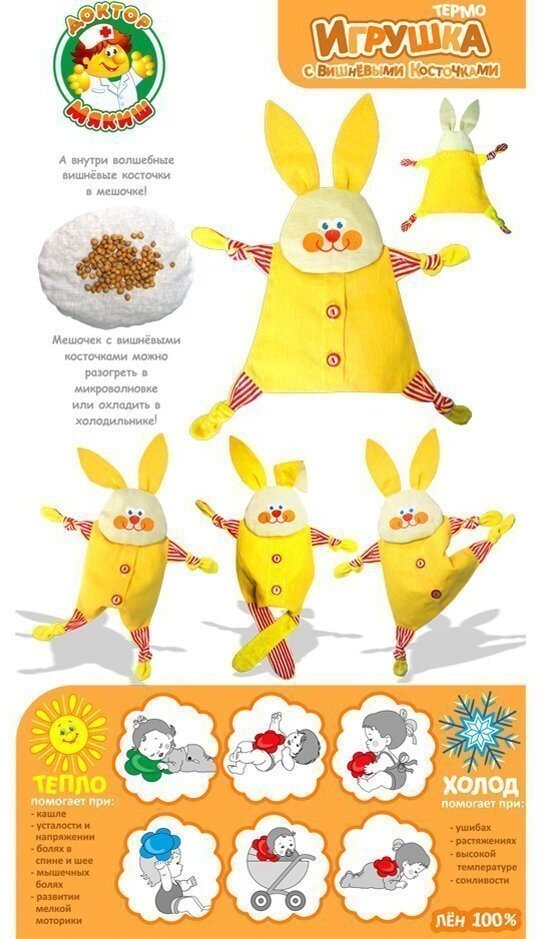 Термоигрушка Доктор Заинька станет лучшим другом вашего малыша при различных недомоганиях. Внутри у игрушки спрятан мешочек с волшебными вишневыми зернышками, его можно охладить в холодильнике или разогреть в микроволновой печи. Теплый Зайка поможет при кашле, мышечных болях, простуде и усталости, а холодный зайка станет спасителем вашего крошки при ушибах, растяжениях и высокой температуре. Кроме того, эта чудесная игрушка способствует развитию мелкой моторики.