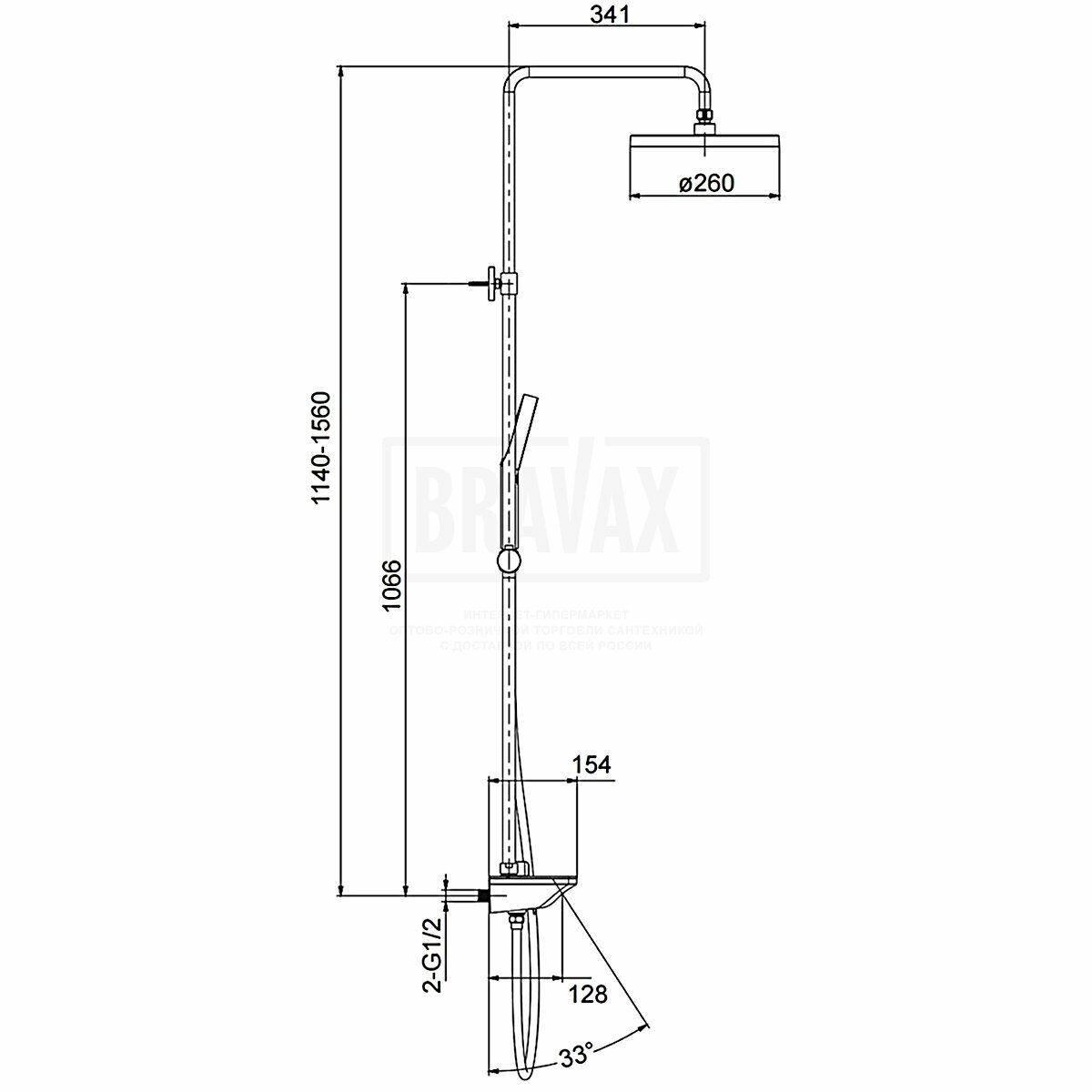 - Диаметр верхнего душа: 260 мм.