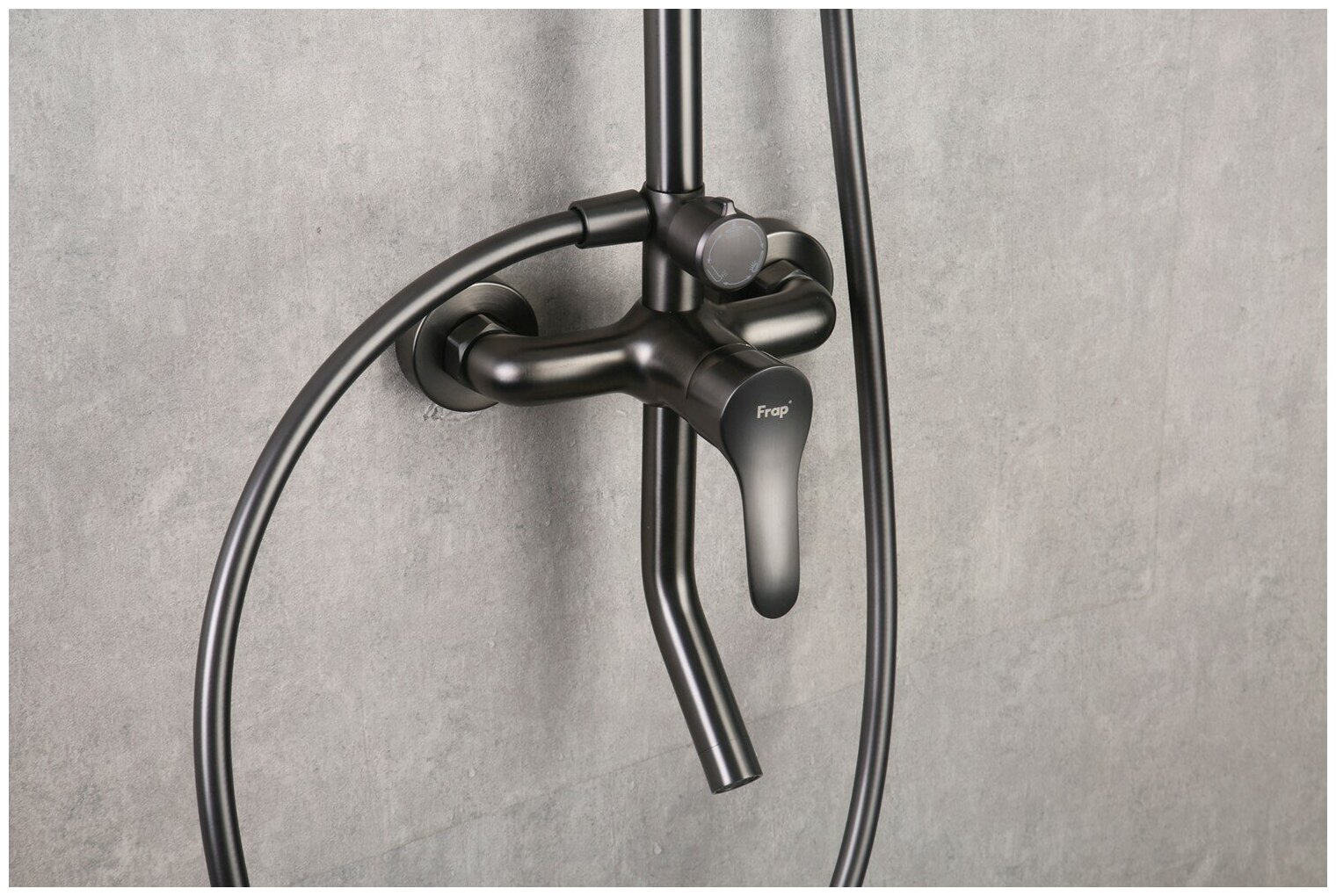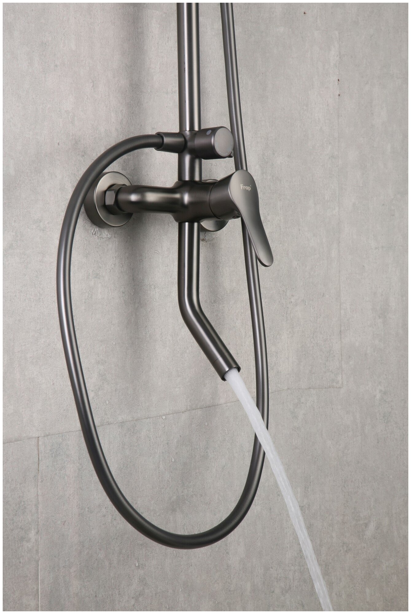 Душевая система Frap F24011-9 с верхним душем и ручной 3-режимной лейкой, цвет оружейная сталь. Благодаря современному округлому дизайну прекрасно впишется в интерьер любой ванной комнаты.
