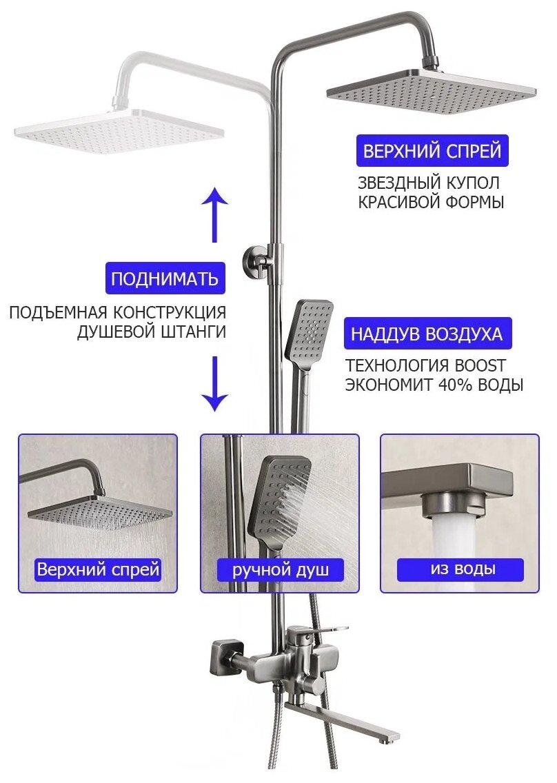 | Комплект поставки | ручной душ, лейка, излив для набора воды, верхний душ, шланг, держатель лейки |