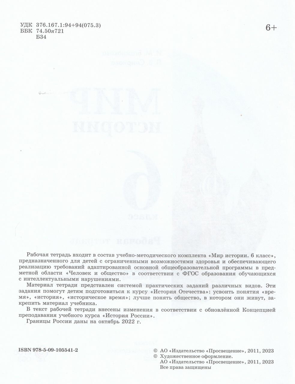 Рабочая тетрадь входит в состав учебно-методического комплекта "Мир истории. 6 класс", предназначенного для детей с ограниченными возможностями здоровья и обеспечивающего реализацию требований адаптированной основной общеобразовательной программы в предметной области "Человек и общество" в соответствии с ФГОС образования обучающихся с интеллектуальными нарушениями.