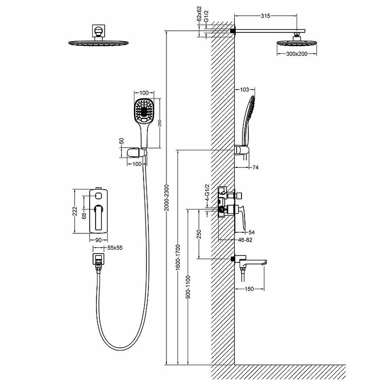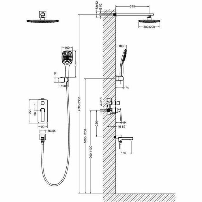 | Состав комплекта | верхний душ, настенный держатель, смеситель, излив, душевой гарнитур |
