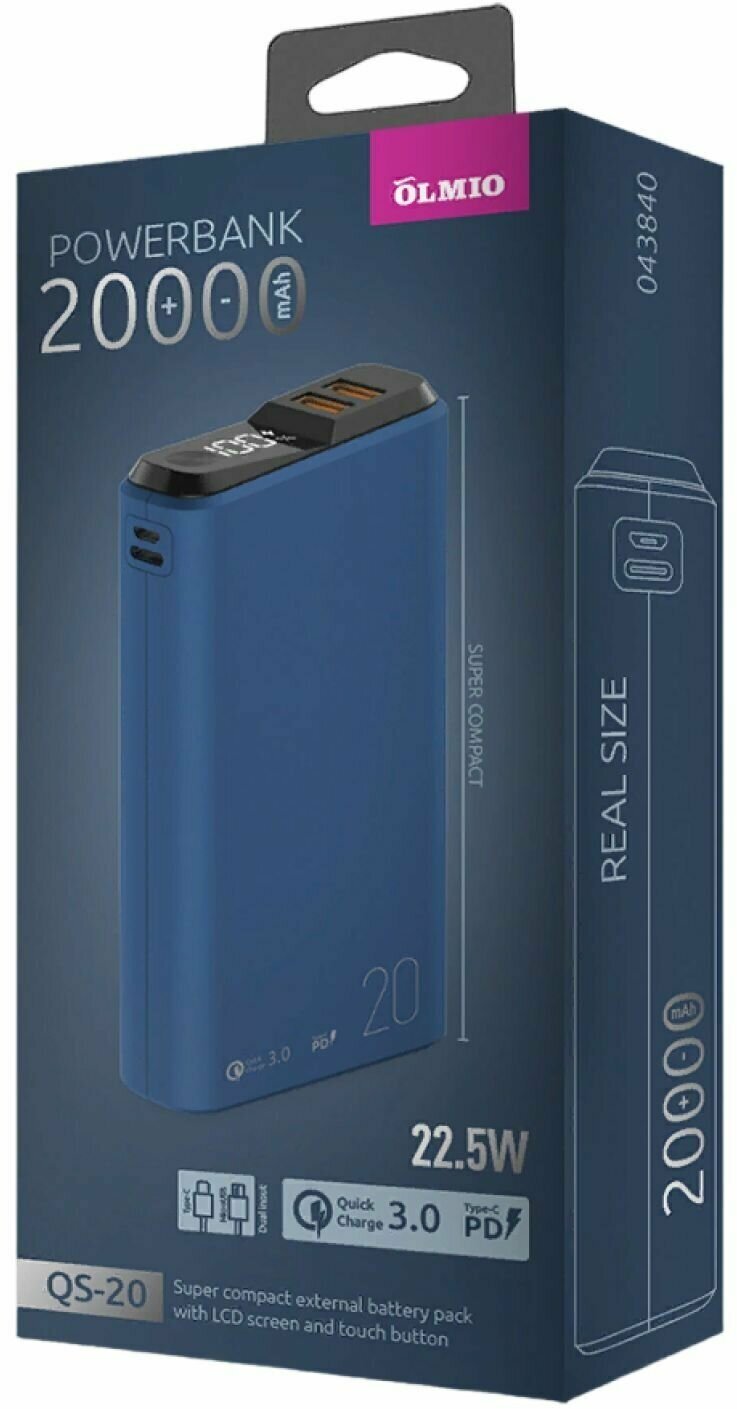 Внешний аккумулятор OLMIO QS-20 20000mAh deep-blue QS-20 темно-синий, 20000mAh, 20W, QuickCharge3.0/PowerDelivery, LCD