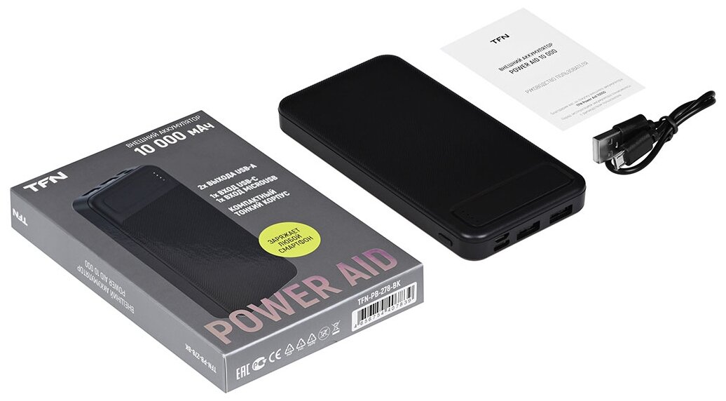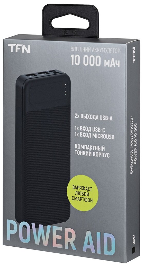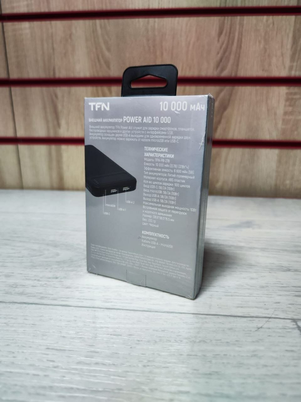 Емкость внешнего аккумулятора TFN PowerAid — 10 000 мАч. Он оснащен двумя портами USB типа A и позволяет одновременно заряжать два совместимых девайса. Также предусмотрены разъемы microUSB и USB типа C. Корпус изготовлен из пластика. Запас энергии во встроенной батарее восстанавливается примерно за три часа. Есть светодиодная индикация оставшегося заряда. Размеры — 136,6 х 68,5 х 15,5 мм, вес — 2