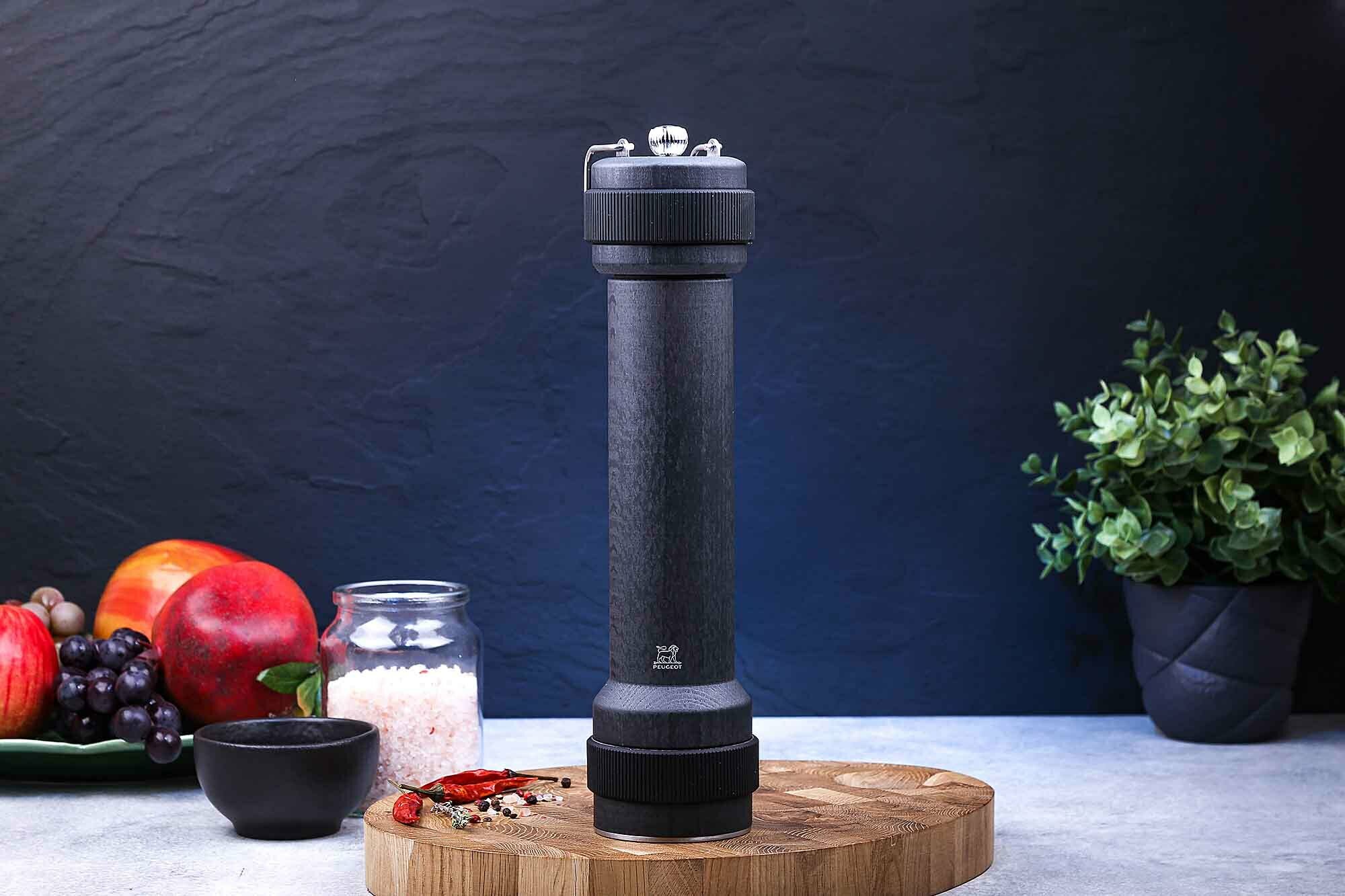 Корпус изделия выполнен из дерева в благородном сером цвете. Мельница дополнена подсветкой для того, чтобы процесс приготовления на природе был максимально комфортным.