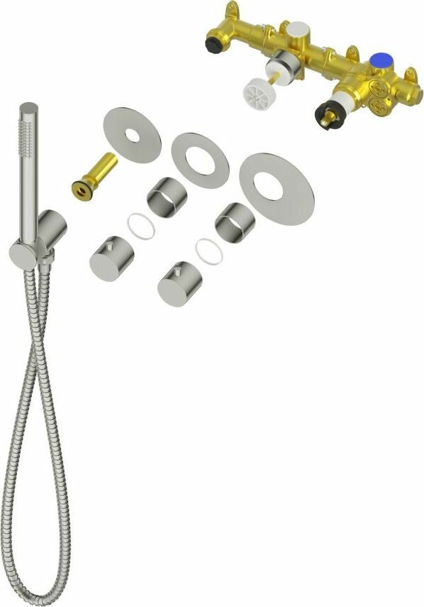 | Комплектация | Встраиваемый блок управления душевой системой (латунный)-1 шт. Термостатический картридж-1 шт. Дивертор-1 шт. Декоративная крышка картриджа-1 шт. Гайка-1 шт. Декоративные гильзы-2 шт. Декоративные накладки-3 шт. Ручка управления термостатом-1 шт. Ручка дивертора-1 шт. Соединительная трубка для подключения ручного душа-1 шт. Держатель ручной лейки с подключением душа (латунный)-1 шт. Ручная лейка (латунная)-1 шт. Шланг душа 1,5 м-1 шт. Держатель тропического душа (латунный)-1 шт. Тропический душ (пластик)-1 шт. Инструкция-1 шт. |
