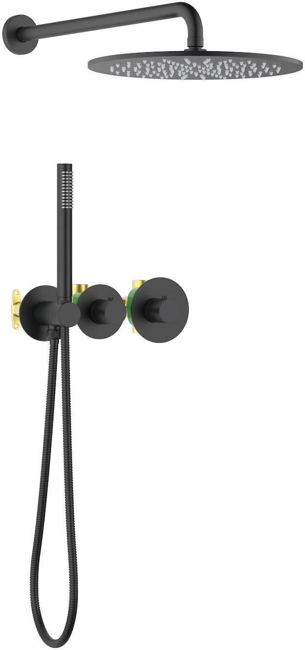 Душевая система с термостатом, скрытого монтажа с круглой лейкой в стиле модерн Душевая система сделана из латуни класса А Коллекция Saona Управление двухрычажное Цвет душевой системы Черный Цвет верхней лейки Черный Цвет ручной лейки Черный Материал лейки тропического душа пластик Материал ручной лейки латунь Угол наклона верхней лейки регулируется Размер верхнего душа O 300 мм Диаметр керамического картриджа 35 мм,с термостатом Официальная гарантия 60 месяцев (5 лет. Черная сантехника становится все более популярной для ванных комнат из-за спосбности расставлять акценты. Встраиваемая душевая система с термостатом Timo Saona 2359 относится к премиальному сегменту, предназначена для монтажа в полой или твердой стене. Термостатический картридж поддерживает стабильную температуру воды, обеспечивая максимально комфортные условия для принятия водных процедур. Верхний душ создает имитацию проливного дождя, вода обливает человека целиком. Регулируя напор воды можно получить массажное воздействие, что очень полезно для здоровья. Основные преимущества встроенной системы: элегантный внешний вид, все коммуникации и крепления спрятаны в стену и потолок, снаружи видны только декоративные элементы. Установить встроенную систему можно в любом месте. Сложностей монтажа не возникает при установке элементов душевой системы опытным сантехником. Внимательно изучите инструкцию по монтажу и эксплуатации. Черная сантехника требует бережного ухода. Комплектация: Встраиваемый блок управления душевой системой (латунный)-1 шт. Термостатический картридж-1 шт. Дивертор-1 шт. Декоративная крышка картриджа-1 шт. Гайка-1 шт. Декоративные гильзы-2 шт. Декоративные накладки-3 шт. Ручка управления термостатом-1 шт. Ручка дивертора-1 шт. Соединительная трубка для подключения ручного душа-1 шт. Держатель ручной лейки с подключением душа (латунный)-1 шт. Ручная лейка (латунная)-1 шт. Шланг душа 1,5 м-1 шт. Держатель тропического душа (латунный)-1 шт. Тропический душ (пластик)-1 шт. Инструкция-1 шт.