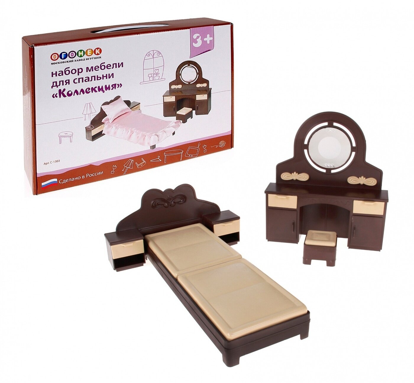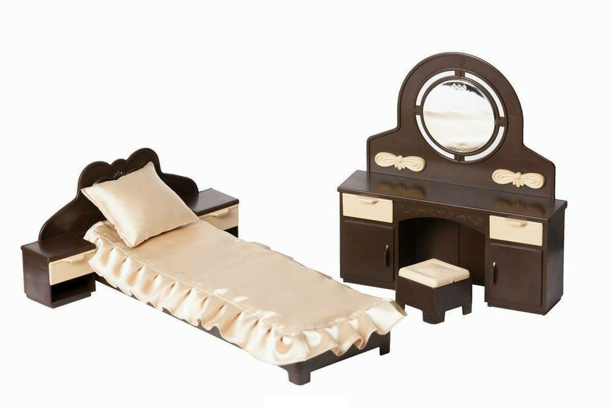Игрушки и игровые комплексы Набор мебели для кукольной спальни. В набор входит: трюмо с зеркалом и пуфиком, кровать с изголовьем. Игрушка выполнена из качественных и безвредных материалов.