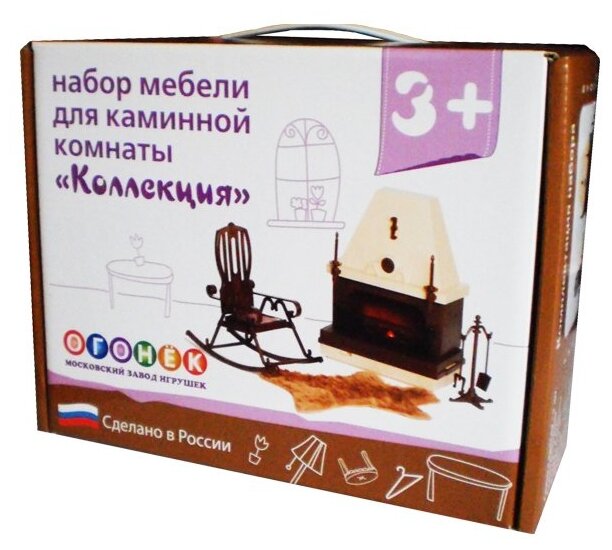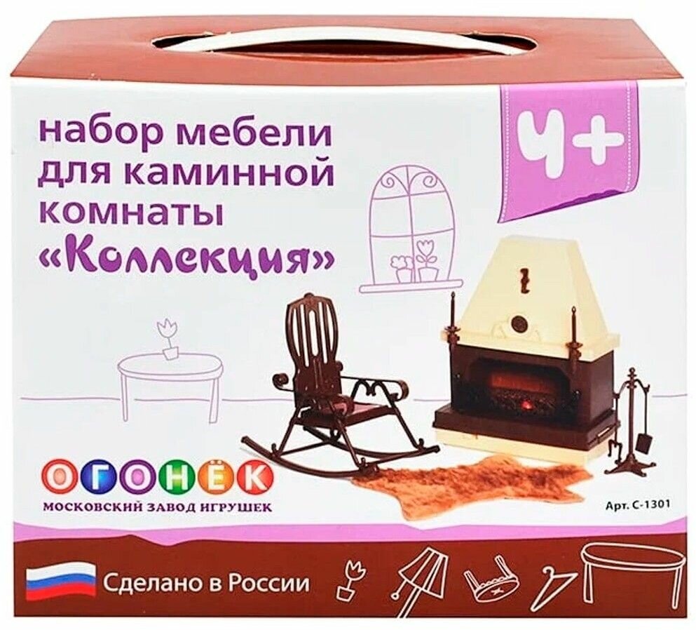 Набор мебели для кукольной каминной комнаты от завода Огонек. В него входит: камин, кресло-качалка, подставка для каминных принадлежностей, ковер в виде меховой шкуры. Для имитации пламени в камине установлена лампа, которая работает от элемента питания 3336. Красивая игрушка помогает ребенку развить свою фантазию, воспитывает художественный вкус.