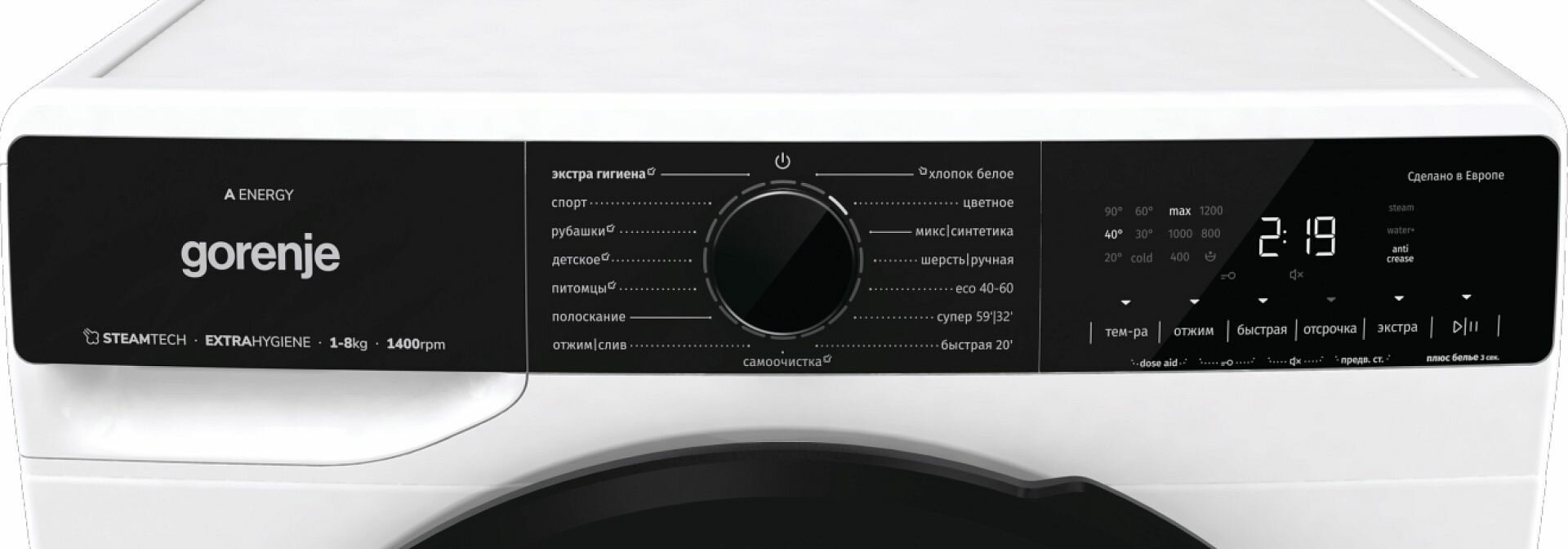 | Программы | Хлопок, Стирка шерсти/Ручная стирка, Микс/Синтетика, Питомцы, Экстрагигиена, Детская одежда, Эко 40–60, Спорт, Быстрая 20', Интенсивная 59', Рубашки, Самоочистка SterilTub, Отжим/Слив, Полоскание/Смягчение |