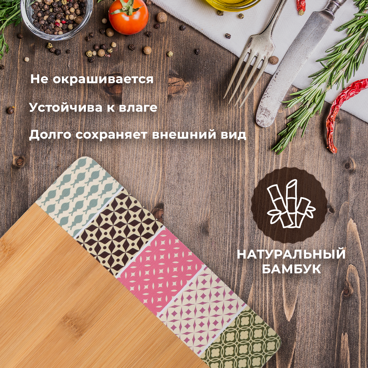 Разделочная доска Пэчворк бамбук, 33x23x1 см 17705 предназначена для разделки и измельчения всех видов продуктов.