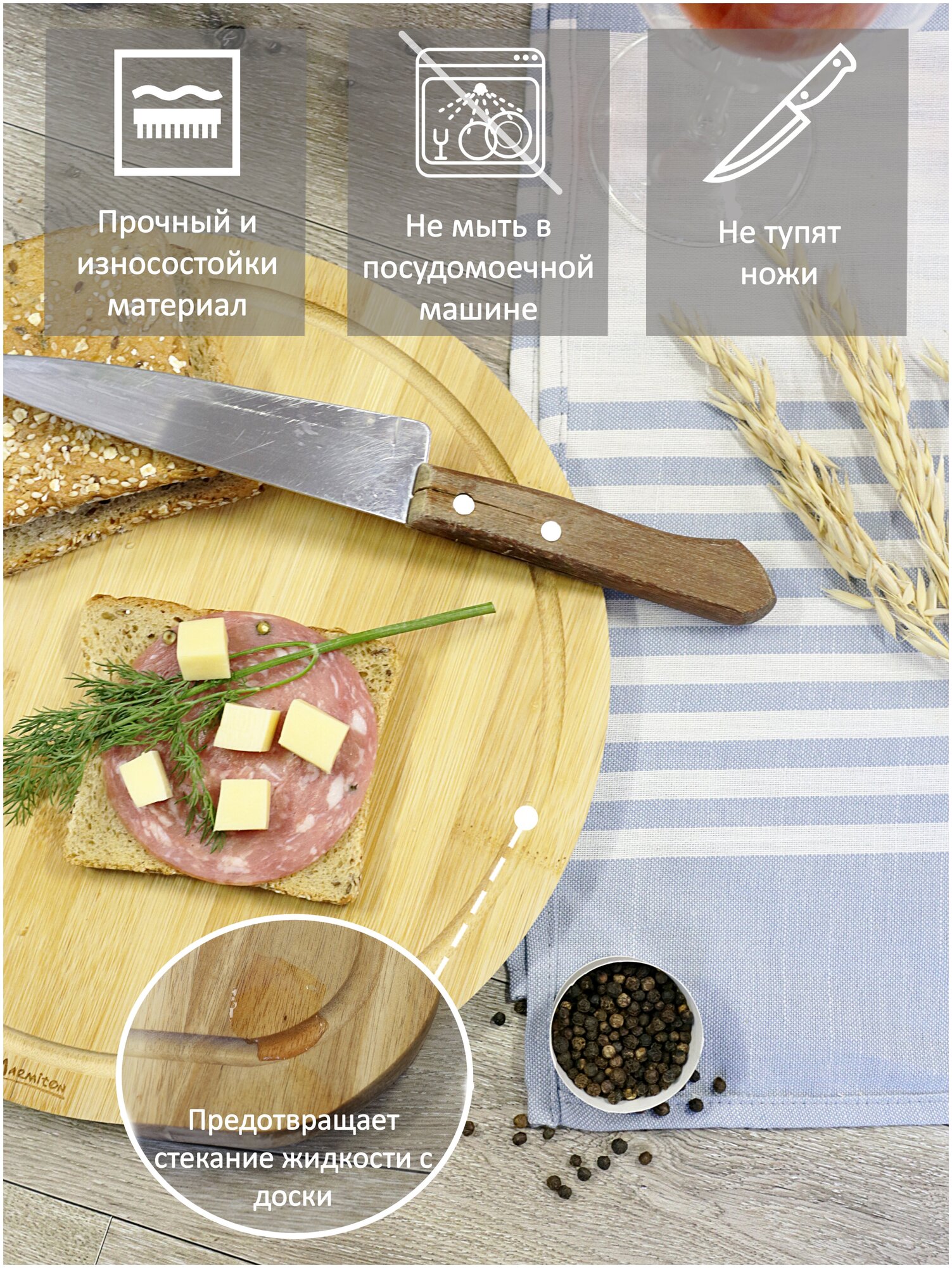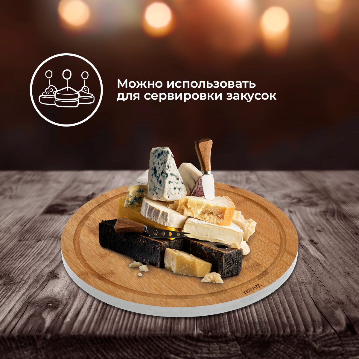 Для сервировки стола, эффектной подачи закусок. Подходит для разделки и измельчения всех видов продуктов. Доски из бамбука отличаются высокой прочностью и износоустойчивостью, устойчивостью к механическим воздействиям и окрашиванию. По краю доски проходит небольшой желоб, который предохраняет от растекания жидкости (например, сок фруктов и овощей).