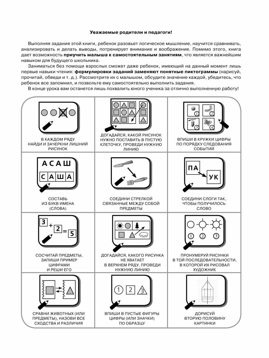 Книги этой серии созданы специально для занятых родителей. Дети вполне смогут заниматься без помощи взрослых: формулировки заданий заменяют понятные пиктограммы так, чтобы ребенок сразу понял, что требуется сделать (нарисуй, прочитай, обведи и т. д.). Такие занятия приучают малыша к самостоятельному выполнению заданий, что является важнейшим навыком для будущего первоклассника.