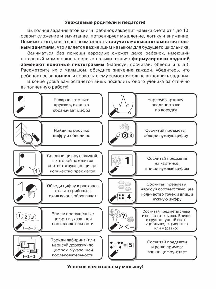Книги этой серии созданы специально для занятых родителей. Дети вполне смогут заниматься без помощи взрослых: формулировки заданий заменяют понятные пиктограммы так, чтобы ребенок сразу понял, что требуется сделать (нарисуй, прочитай, обведи и т. д.). Такие занятия приучают малыша к самостоятельному выполнению заданий, что является важнейшим навыком для будущего первоклассника.