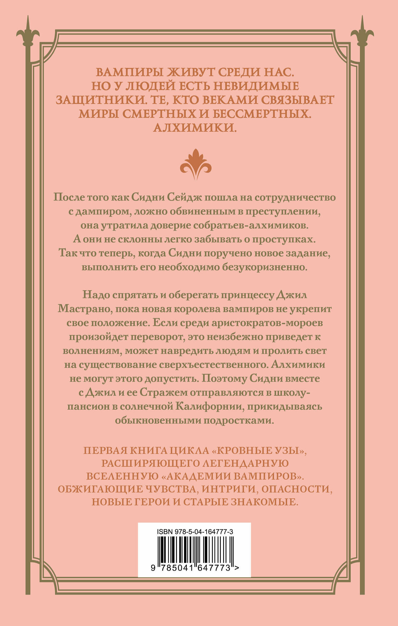 Первая книга цикла «Кровные узы», расширяющего легендарную вселенную «Академии вампиров». Оригинальная история, которую можно читать как самостоятельный цикл, а действующими лицами становятся не только вампиры и дампиры, но и алхимики — люди, чья задача, чтобы существование сверхъестественного оставалось в тайне.