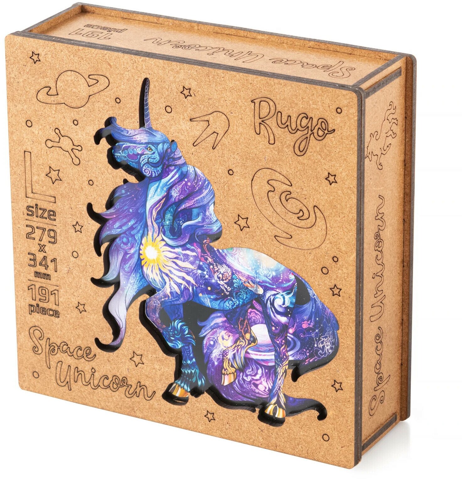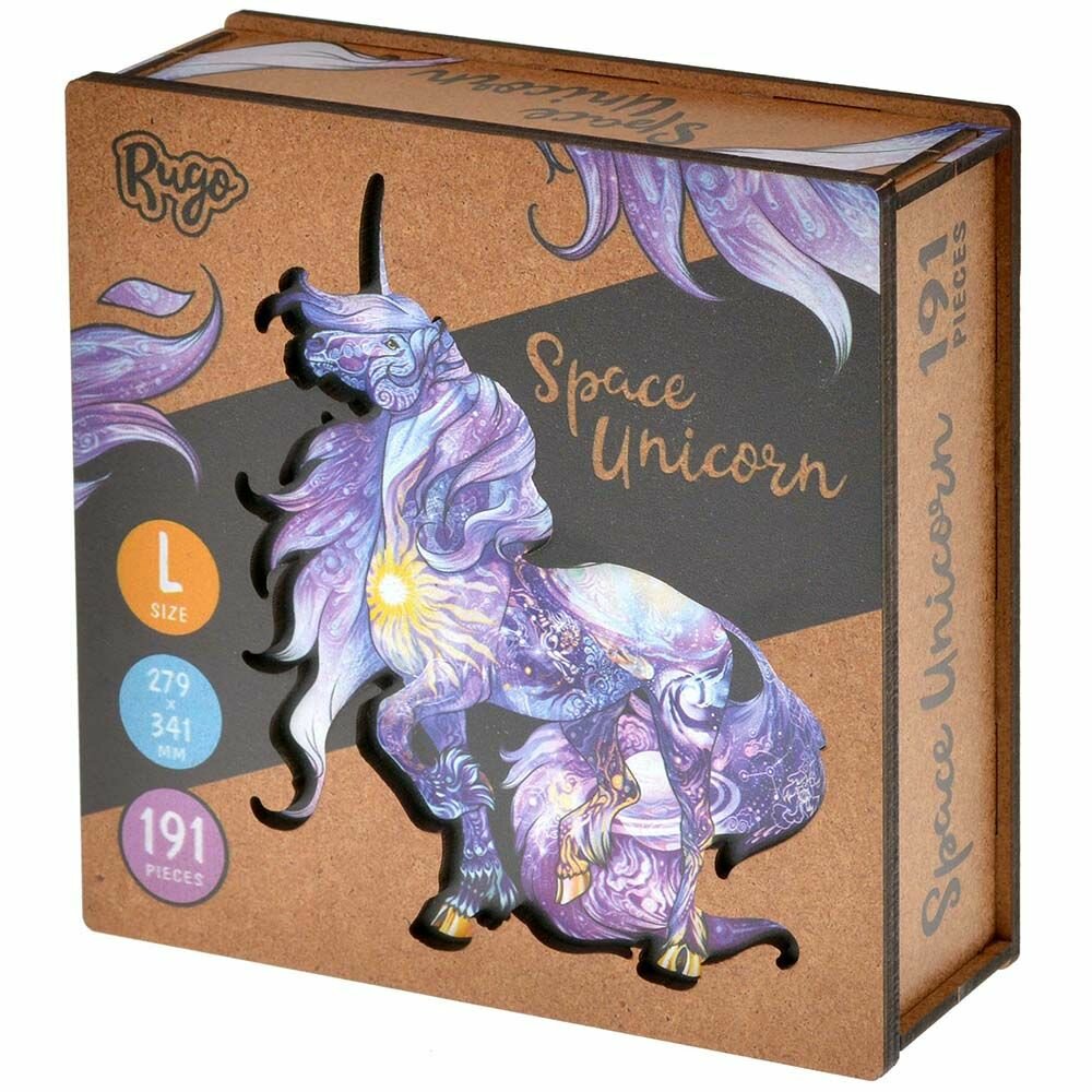 Единорог - долгожданный, космический, мифический. Мы все очень долго ждали и мечтали о появлении волшебного Единорога в нашем лесу. Он появился для вас.. По-истине космический, чарующий, полный тайн и несущий к звездам!Наш Единорог необычен, он познакомит Вас с космосом и знаками зодиака, с ним вы увидите необычные космические корабли. Приготовитесь, космическое путешествие начинается!)Желаем Вам приятного приключения во время сборки пазла! Множество деталей помогут развивать мелкую моторику и логику, а время проведённое за сборкой пазла пролетит незаметно. Пазл состоит из 191 деталей, размер собранного пазла 28х34 см. Мы особенно гордимся серией Art. Каждая деталь - отдельная история, а иллюстрация наполнена мельчайшими деталями, которые точно заставят вас хорошенько приглядеться. Наши деревянные пазлы для взрослых - отличный подарок на любой праздник: новый год, рождество, 8 марта, 23 февраля, 14 февраля, 9 мая. Головоломка может подойти как подарок мужчине, маме, для девочки, девушке, папе, парню, мужу, подруге, женщине, бабушке и просто на день рождения. Также, наши пазлы для детей - это отличные развивающие игрушки для мальчиков и для девочек. Порадуйте себя и близких, выбрав подарочный набор от RUGO!