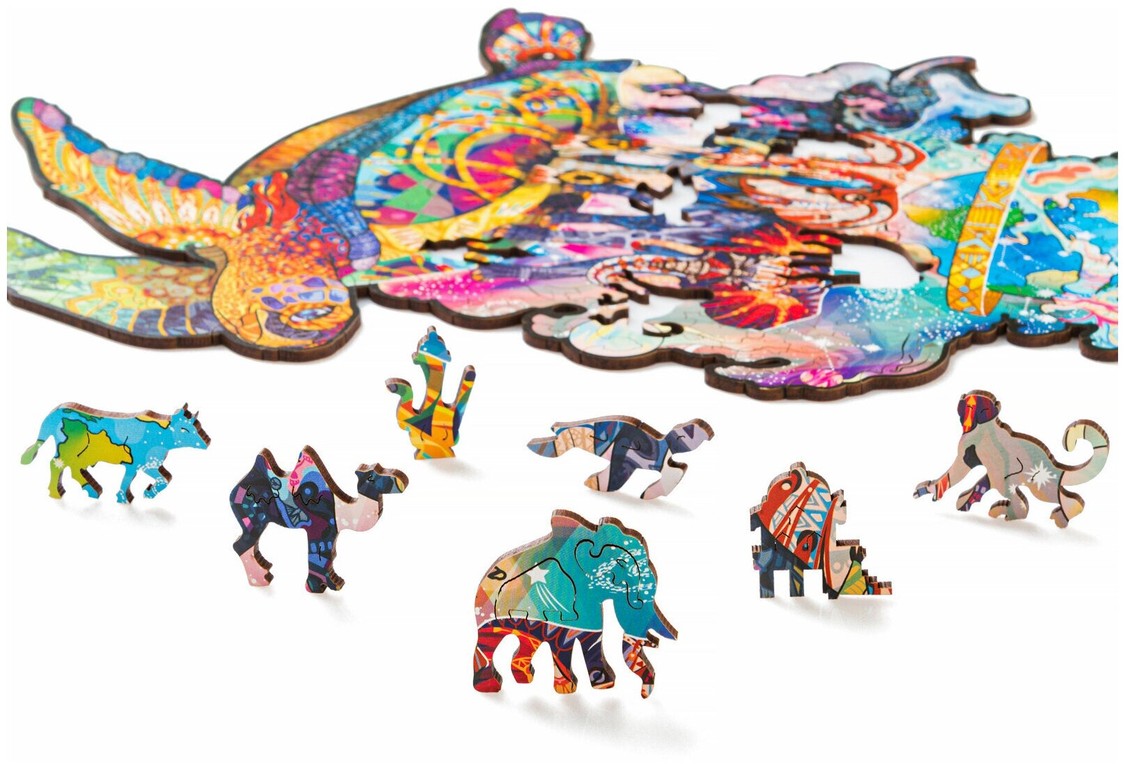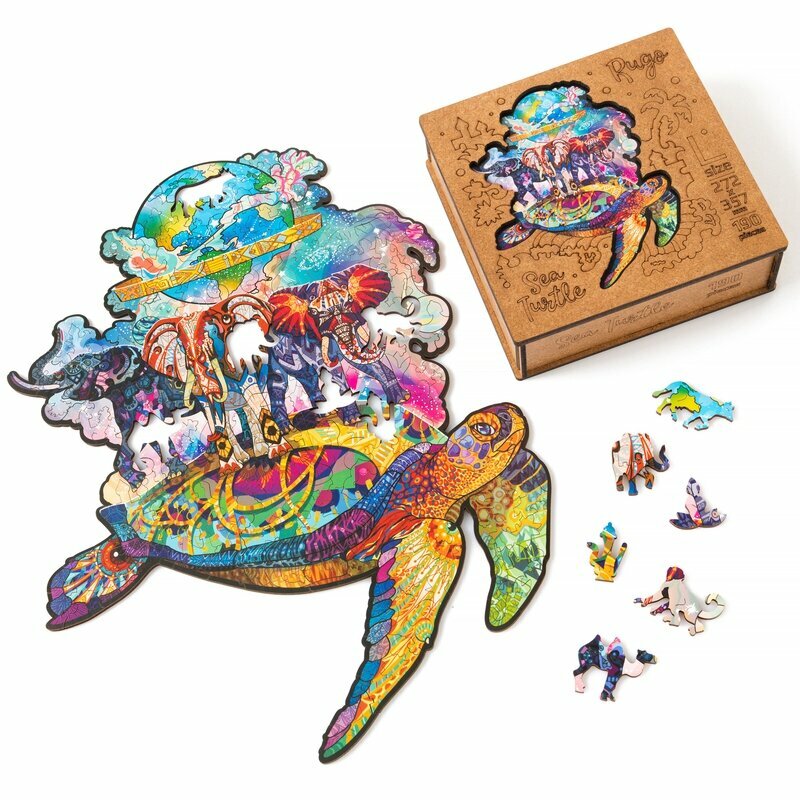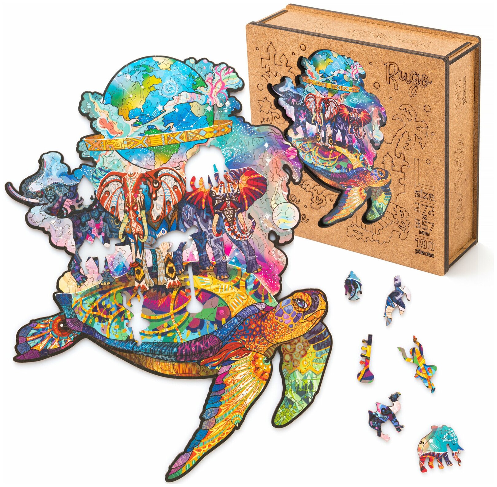 Прародительница миров - древняя Черепаха. Она все время плывёт по поверхности Мирового океана, нёся на себе Трех Слонов, которые держат наш Мир. Вместе с ней Вы исследуете все уголки Земли, увидите красоту суши и моря. Осторожно, не упадите с Края Земли!)Желаем Вам приятного приключения во время сборки пазла! Множество деталей помогут развивать мелкую моторику и логику, а время проведённое за сборкой пазла пролетит незаметно. Пазл состоит из 190 деталей, размер собранного пазла 27х36 см. Мы особенно гордимся серией Art. Каждая деталь - отдельная история, а иллюстрация наполнена мельчайшими деталями, которые точно заставят вас хорошенько приглядеться. Наши деревянные пазлы для взрослых - отличный подарок на любой праздник: новый год, рождество, 8 марта, 23 февраля, 14 февраля, 9 мая. Головоломка может подойти как подарок мужчине, маме, для девочки, девушке, папе, парню, мужу, подруге, женщине, бабушке и просто на день рождения. Также, наши пазлы для детей - это отличные развивающие игрушки для мальчиков и для девочек. Порадуйте себя и близких, выбрав подарочный набор от RUGO!