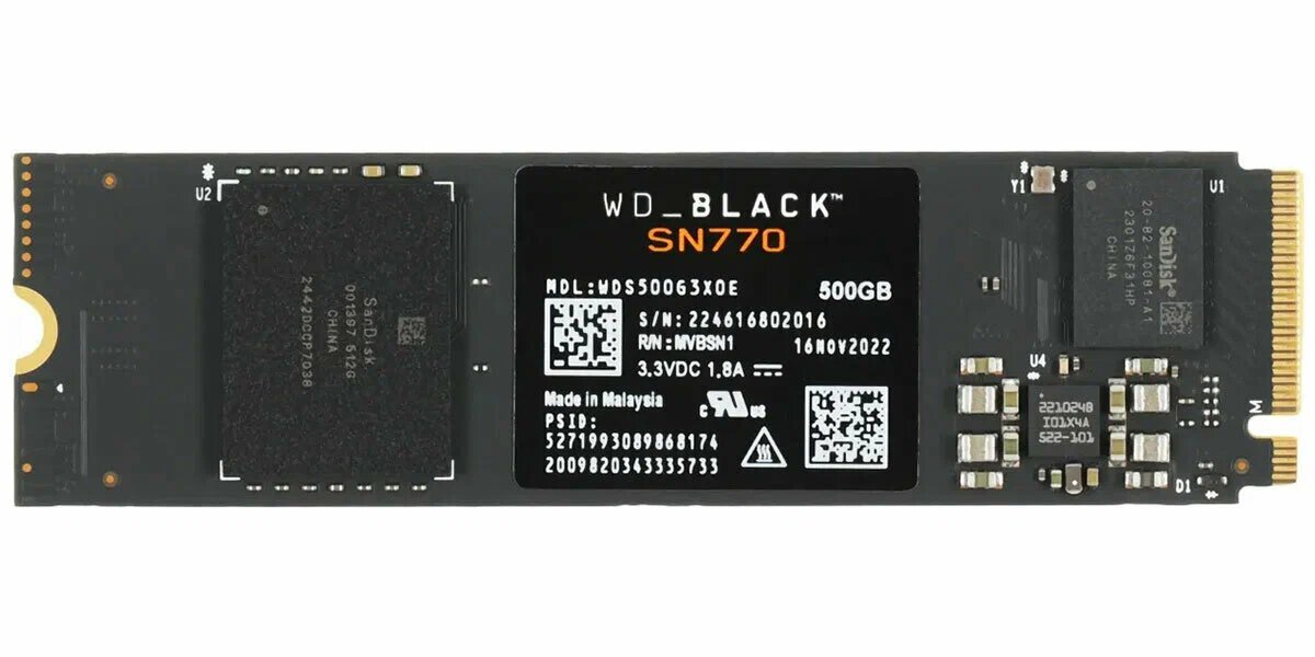 M.2 накопитель WD Black SN770 благодаря применению высокоскоростного интерфейса PCI-E 3.x x4 обеспечивает значительное ускорение загрузки и выполнение различных требовательных задач в системе ПК. Он ориентирован на игровые системы и способен справляться с интенсивными рабочими нагрузками. В режиме последовательного чтения скорость достигает показателя 5150 Мбайт/сек. Объем 1000 ГБ предоставляет возможность размещения большого количества документов, мультимедийных файлов, игр. ПО SSD Dashboard позволяет контролировать параметры и выполнять настройку WD Black SN770.