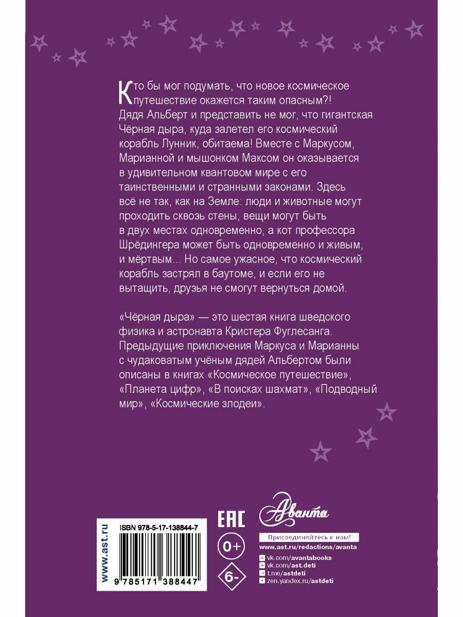 Книга шведского астронавта и писателя Кристера Фуглесанга «Чёрная дыра» — шестая сказка из цикла о приключениях учёного дяди Альберта и детей — Маркуса и Марианны. На этот раз друзей ждут приключения в удивительном квантовом мире, где всё не так, как на Земле: люди и животные могут проходить сквозь стены, вещи могут быть в двух местах одновременно, а кот профессора Шрёдингера может быть в одно и то же время и жив, и мёртв. В конце книги есть пояснения многих любопытных явлений из мира физики.