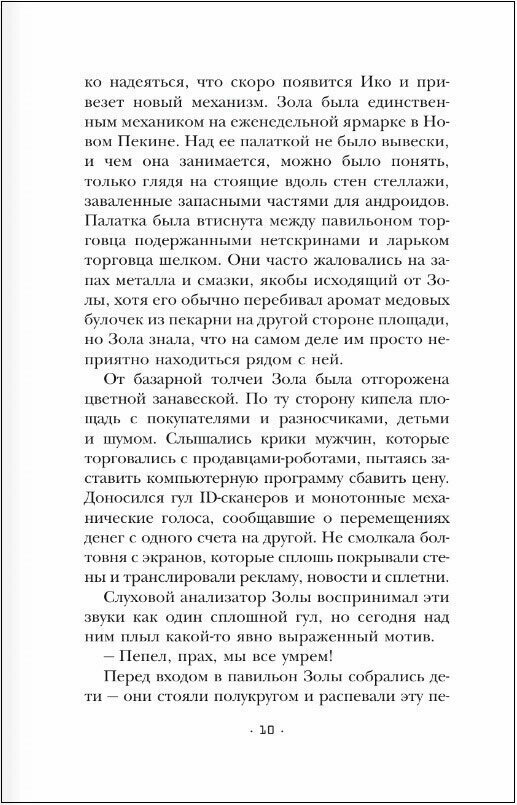 Целые дни шестнадцатилетняя Зола чинит на рынке чужие портскрины и андроиды. Она лучший механик Нового Пекина, и ее слава достигла королевского дворца. Но немногие знают, что они киборг. Давным-давно, после несчастного случая, маленькую Золу спасли, вмонтировав в ее тело металлические части тела и электронную нервную систему. Теперь, едва узнав об этом, люди сторонятся ее, а мачеха с двумя дочками без конца осыпает упреками.