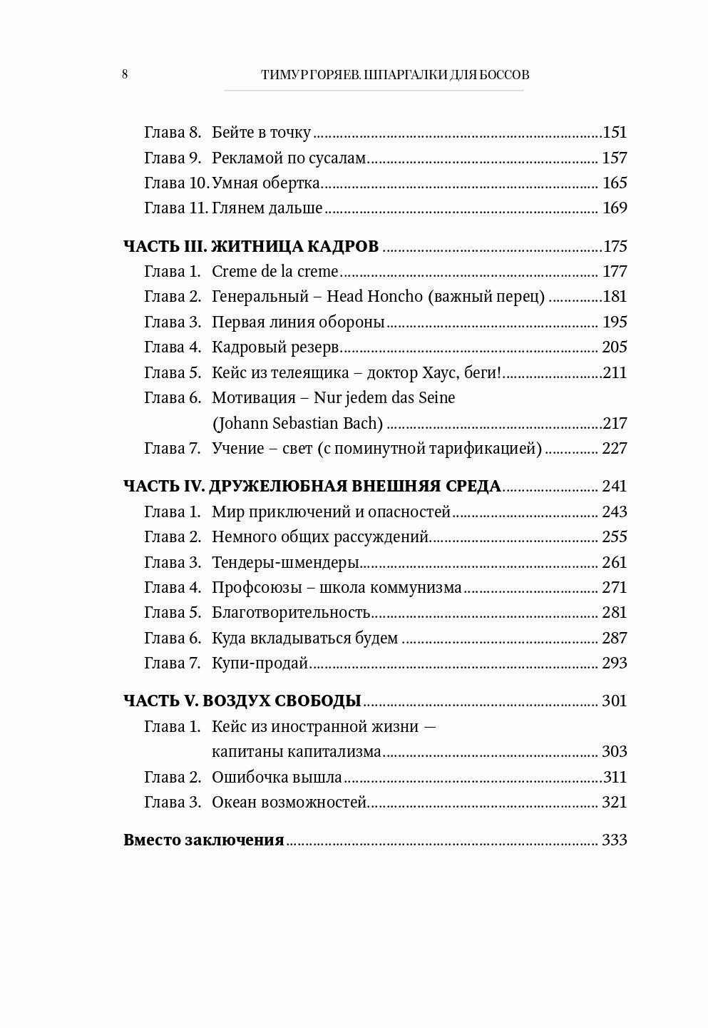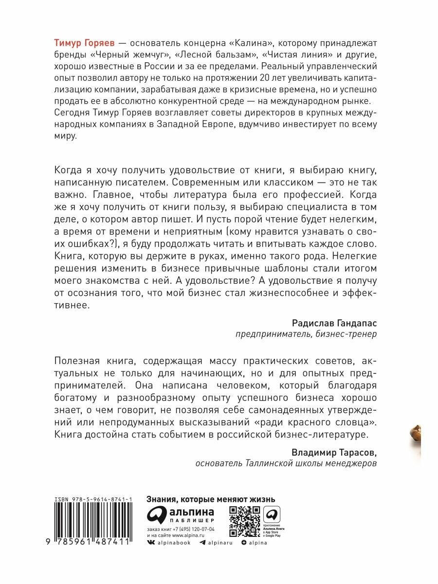 На примере конкретных кейсов из собственной практики автор правдиво и иронично разбирает ключевые вопросы предпринимательства: выбор цели и постановку задач, воспитание корпоративных ценностей и определение маркетинговых доминант, выработку стратегии и действия руководителя в постоянно меняющейся и совсем недружелюбной внешней среде.