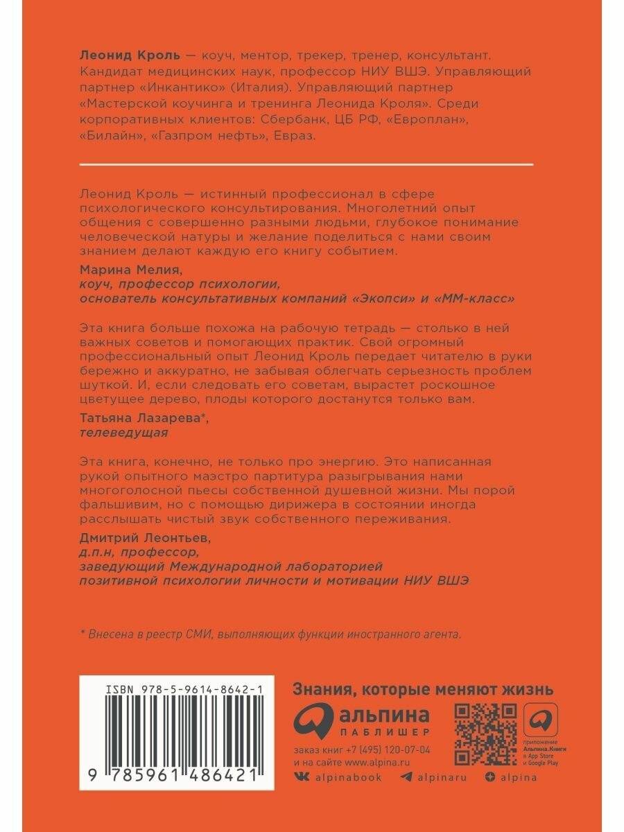 Леонид Кроль — профессор Высшей школы экономики с 25-летним опытом работы коучем и бизнес-тренером, директор Института групповой и семейной психологии и психотерапии — рассказывает о проблемах с энергией, а также показывает, как управлять ею, используя то, что заложено природой в конкретном человеке. В каждой главе — кейсы из реальной практики, фрагменты коучинговых бесед, а в конце книги — приложение с 12 энергетическими профилями, которые помогут вам узнать о себе много полезного и правильно начать работу по балансировке жизненных сил.