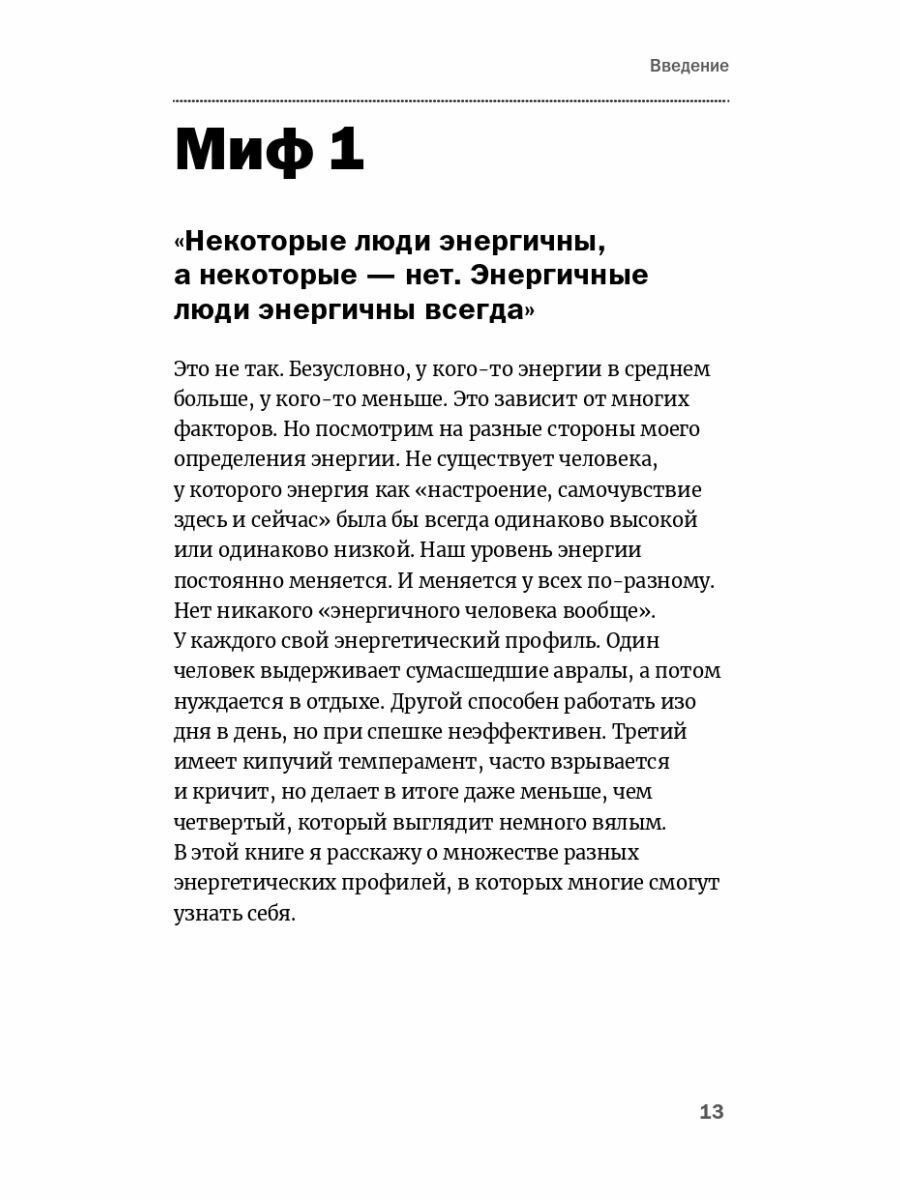 Наш уровень энергии постоянно меняется. И меняется у всех по-разному. Нет никакого «энергичного человека вообще». У каждого свой энергетический профиль. Один человек выдерживает сумасшедшие авралы, а потом нуждается в отдыхе. Другой способен работать изо дня в день, но при спешке неэффективен. Третий имеет кипучий темперамент, часто взрывается и кричит, но делает в итоге даже меньше, чем четвертый, который выглядит немного вялым. В этой книге я расскажу о множестве разных энергетических профилей, в которых многие смогут узнать себя.