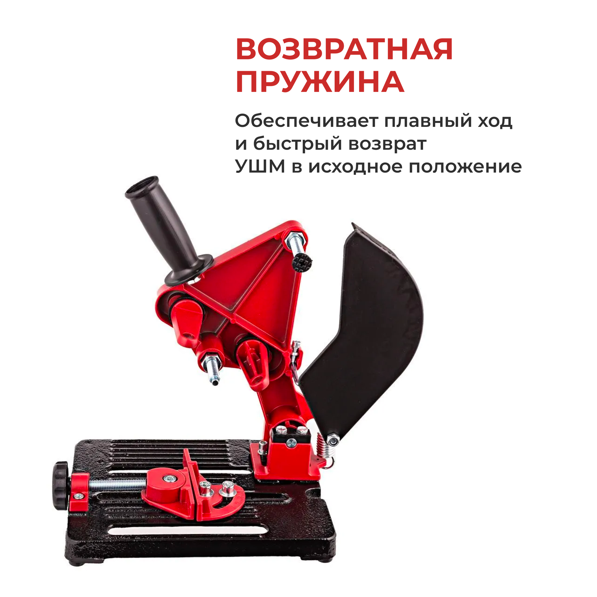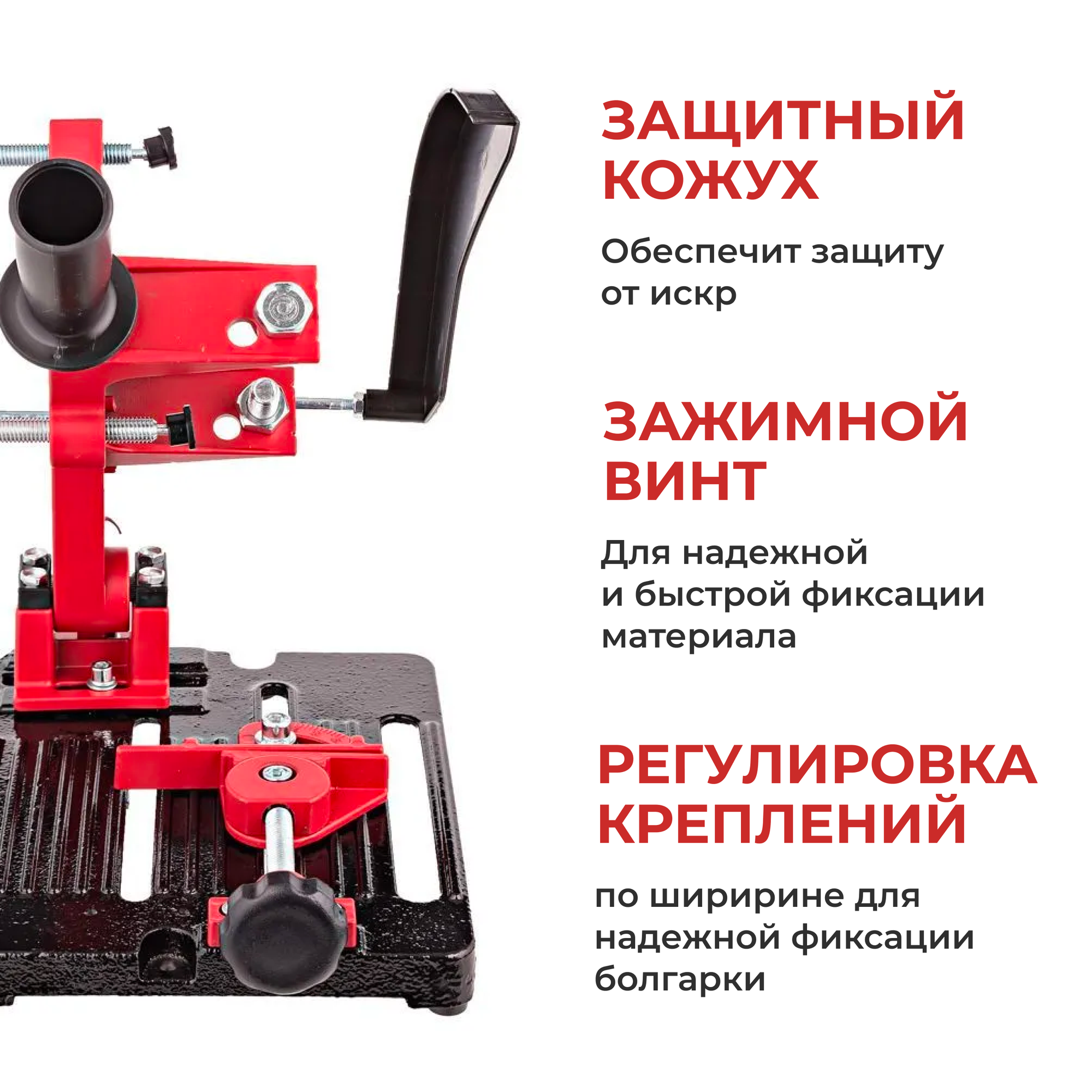 Стойка для болгарки позволяет отпиливать материал с высокой точностью. Инструмент подходит для болгарок моделей 100-125 мм. Максимальная глубина прорезания составляет 30 мм, угол реза 0-45 градусов. Вес изделия - 2,7 кг. Благодаря защитному экрану ушм можно выполнять работу безопасно для рук и лица. Эргономичная конструкция электро инструментов позволяет комфортно работать в течение длительного времени. Прочный корпус из износостойкой стали обеспечит долгий срок службы. Электрические инструменты подойдут для ремонта и строительства, в качестве садового инвентаря. В набор входит стойка в разобранном виде, подробная инструкция и строительный ремкомплект с четырьмя шестигранными ключами разных размеров. Сборка стойки не вызовет затруднений даже у тех, кто нечасто пользуется строительными инструментами. Удобное, эргономичное управление и плавный ход механизма обеспечат комфортную работу товара. Кронштейн: алюминий. Прочное чугунное основание.