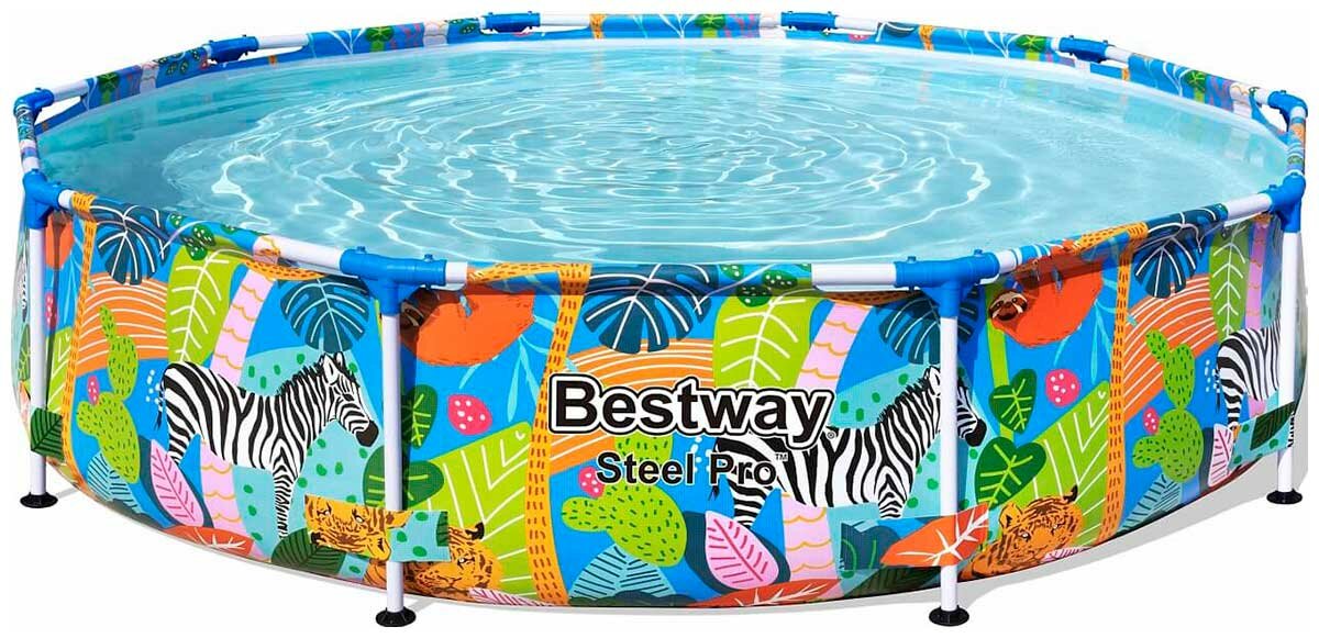 Каркасный бассейн Bestway 56985 отличается яркой расцветкой. Чаша выполнена из высококачественного трехслойного ПВХ: два слоя плотного винила и между ними сетка из полиэстера для особой прочности. Цвет чаши бассейна снаружи разноцветный с элементами джунглей и диких животных. Каркас металлический, покрытый предотвращающим появление коррозии слоем пластика. Не требует бетонирования и подготовки ямы, все, что нужно, это плоская, горизонтальная площадка. Сезонный бассейн (рекомендуется разбирать на холодное время года) обладает простой конструкцией - может быть легко разобран и собран заново. Время сборки и подключения бассейна составляет около 20 мин.