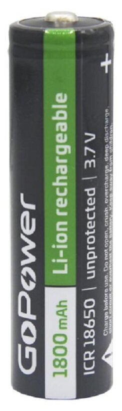 ## GoPower Аккумулятор Li-ion 18650 PC1 3,6В 1800мАч незащищенный с высоким контактом.## Зарядите перд использованием. Не вскрывать, не деформировать, избегать перезаряда и глубокого разряда, не замыкать, не нагревать. ## Беречь от детей.