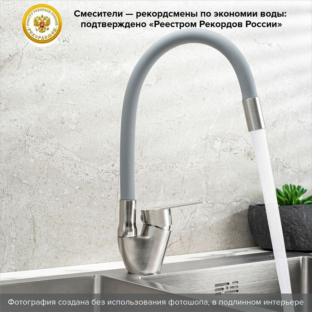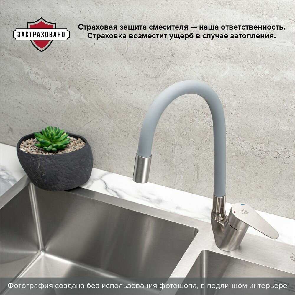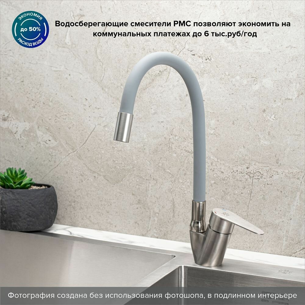 Смеситель для кухни из нержавеющей стали с высоким гибким изливом, выполнен в современном дизайне. Он удачно дополнит мойку любого размера и конфигурации. Покупка водосберегающего смесителя 2.0 РМС - выгодное и практичное решение. С ним вы уменьшите плату за воду. Наш смеситель окупает свою стоимость. Со смесителем 2.0 новой линейки РМС вы снизите расход воды до 50%. Смеситель превращает воду на выходе в воздушно-водную смесь, при этом диаметр струи и сила напора сохраняется. Смесители РМС официально признаны самыми экономичными и занесены в Реестр рекордов России. Пользоваться смесителем РМС 2.0 удобно и приятно. Струя смесителя, образует меньше брызг, а значит, уборка на кухне легче и быстрее. Пузырьки воздуха помогают быстрее и эффективнее удалять загрязнения, поэтому моющих средств расходуется меньше. Новые смесители РМС - российская разработка. Смесители устойчивы к царапинам и перепадам температур, экологичны и безопасны для вашего здоровья. Мы используем только проверенные надежные комплектующие. Ухаживать за смесителем РМС просто: достаточно протирать его мягкой тканью. Чтобы установить смеситель, специальных навыков не потребуется. В обновленных смесителях РМС заложена концепция бережливого потребления. Выбирая их, вы не только экономите собственные средства, но и помогаете сберечь такой ценный природный ресурс, как питьевая вода. Смесители РМС — это сертифицированный продукт с 7-летней гарантией.