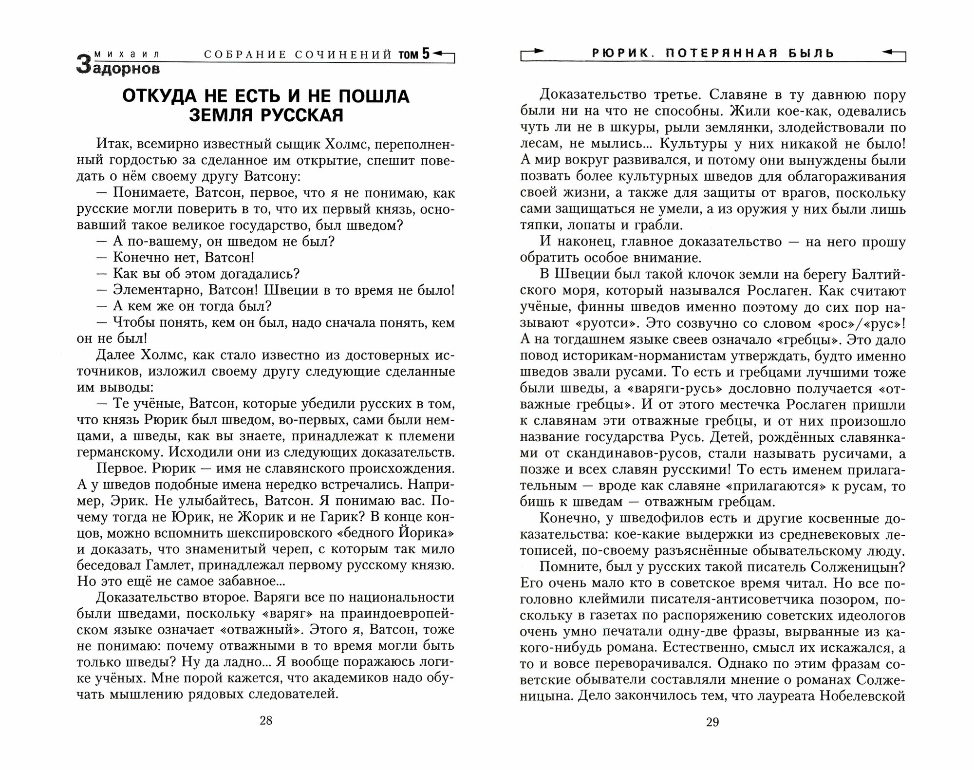 Впервые читателям предоставляется уникальная возможность приобрести собрание сочинений этого удивительного человека. Пятый том раскрывает читателям авторский взгляд на древнерусскую историю, созвучный взглядам историков, не принявших норманскую теорию. Также здесь собраны тексты интервью с Михаилом Николаевичем об истории и его отце, писателе Николае Задорнове. Пьеса «Амур-батюшка» публикуется впервые.