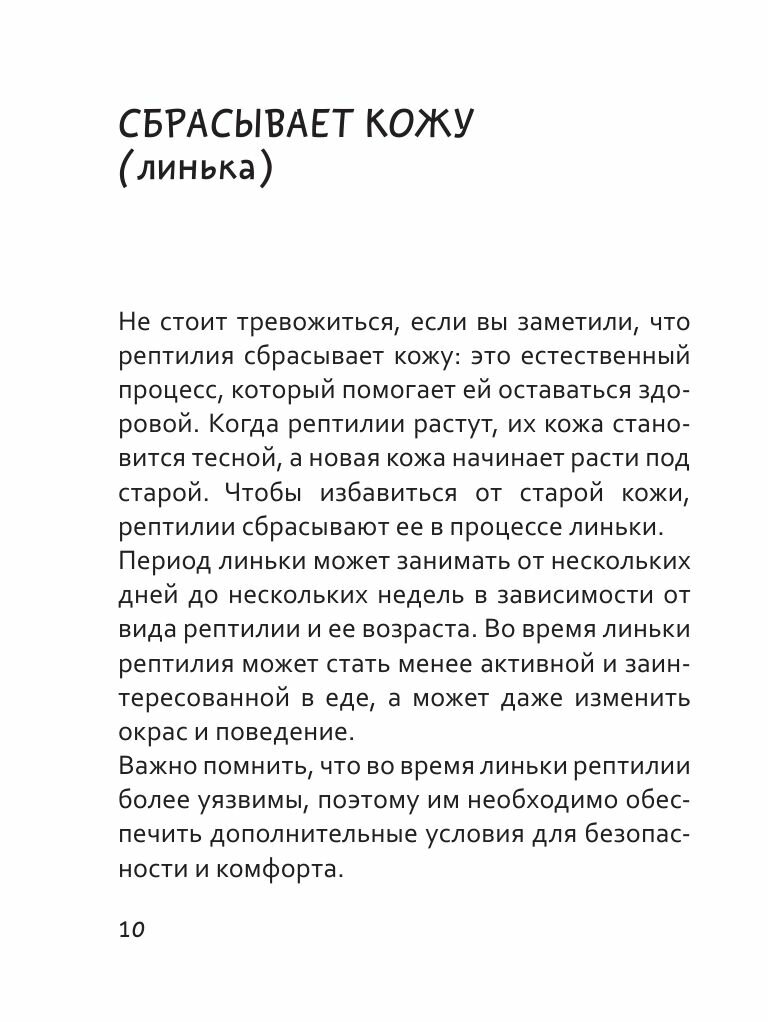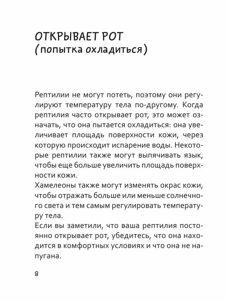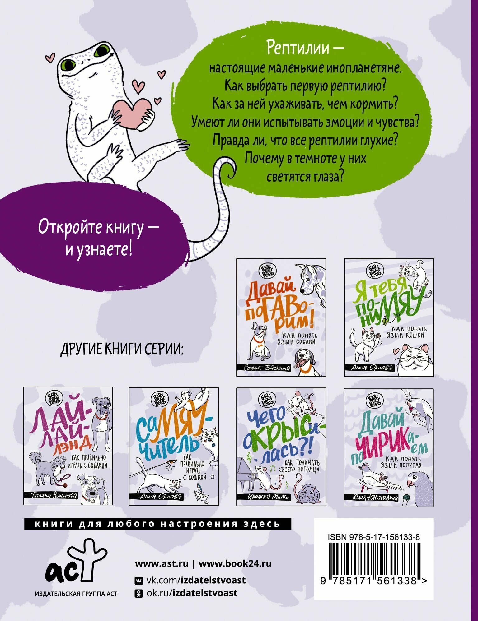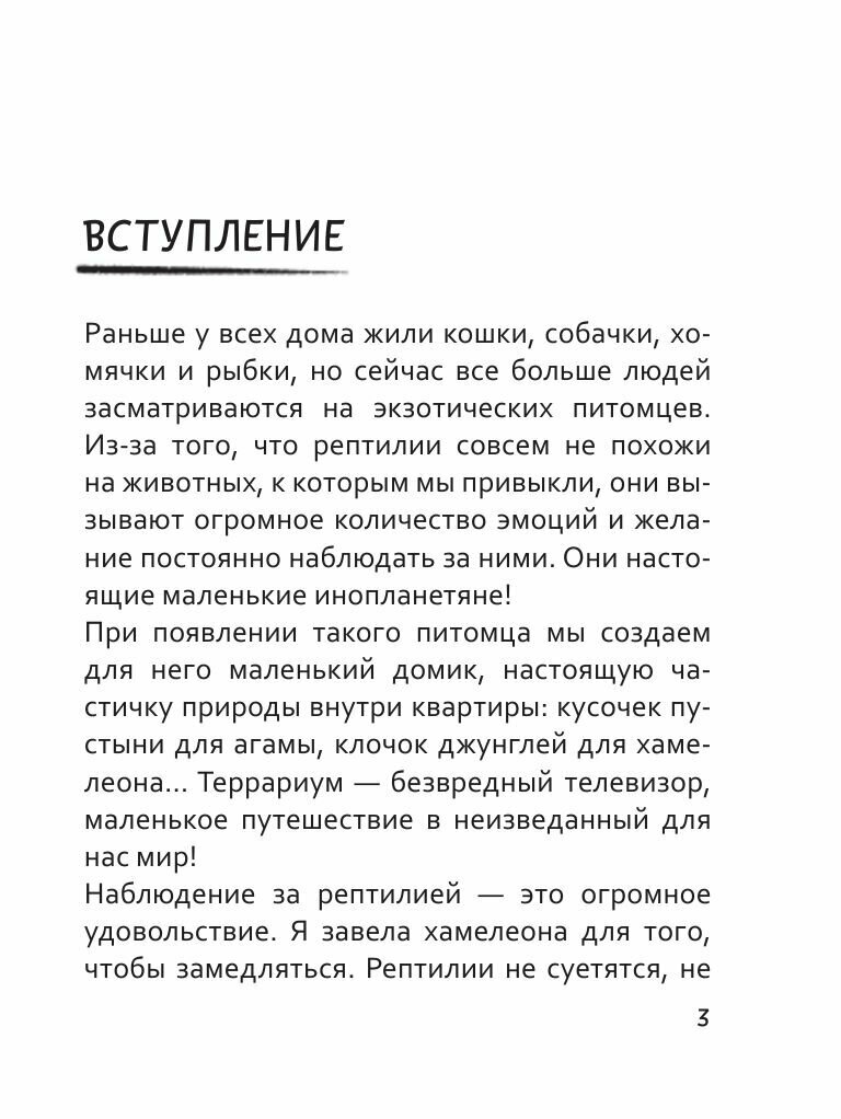 Рептилии — настоящие маленькие инопланетяне. Как выбрать первую рептилию? Как за ней ухаживать, чем кормить? Умеют ли они испытывать эмоции и чувства? Правда ли, что все рептилии глухие? Почему в темноте у них светятся глаза? Откройте книгу — и узнаете!