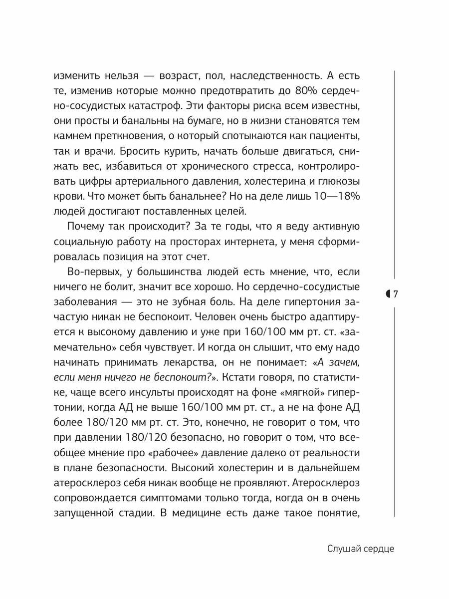 На этих страницах развенчаны мифы о болезнях, здоровье, лекарствах и методах лечения. А главное – каждый найдет в этой книге ключ к решению своей проблемы, будь то пожилой человек или молодой, относительно здоровый или переживший сердечно-сосудистую катастрофу, проходящий лечение или только узнавший диагноз. Это книга-помощник, книга-наставник, книга, которая поможет сделать сердце и сосуды настолько здоровыми, насколько это вообще возможно.