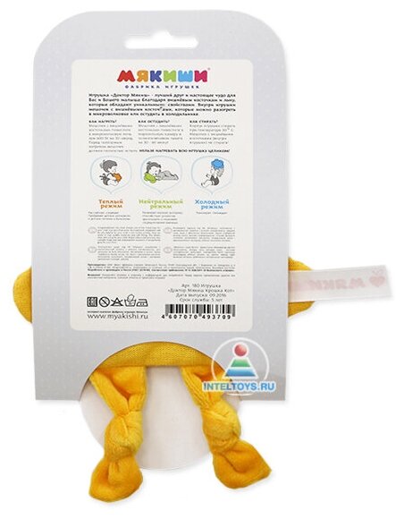Игрушка «Доктор Мякиш» - лучший друг и настоящее спасение для вас и вашего малыша, благодаря вишневым косточкам и натуральному льну, обладающим уникальными терапевтическими свойствами. Внутри игрушки расположен мешочек с вишневыми косточками, которые можно разогреть в микроволновке или остудить в холодильнике. Возникают два вопроса, «зачем это делать?» и «как это работает?». Ответ прост. Использование игрушки в теплом режиме оказывает расслабляющее и согревающее воздействие, помогает при кашле простудного характера. Для нагрева достаточно одной минуты в микроволновой печи при мощности 600 Вт. Холодный режим тонизирует, эффективно избавляет от головной боли и уменьшает отеки при ушибах. Остудить мешочек можно в морозильной камере в течение 30-60 минут, предварительно поместив его в полиэтиленовый пакет. При нейтральном температурном режиме игрушка способствует развитию мелкой моторики, а также зрительного и слухового сосредоточения ребенка.